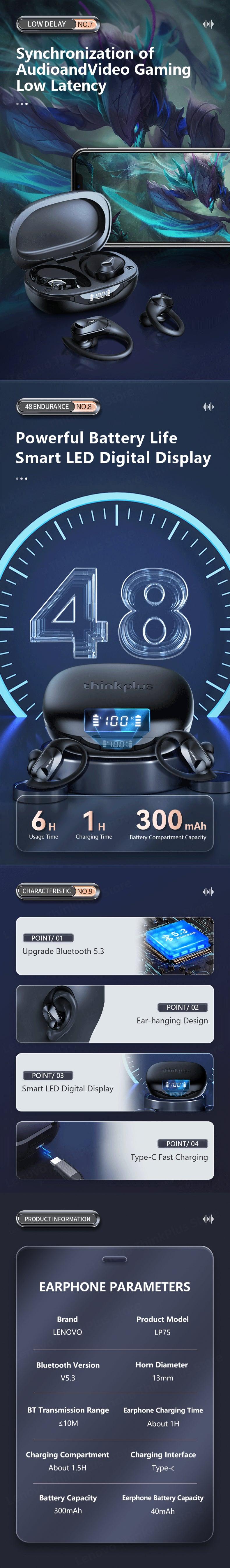 Lenovo LP75 TWS Sports Wireless Bluetooth 5.3 Earphones - IPX5 Waterproof