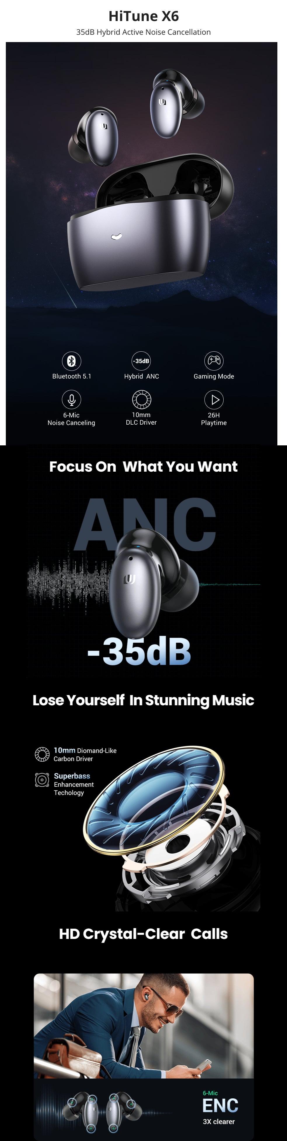 Escape Distractions, Embrace Music: Equipped with 6 built-in microphones (3 in each earphone), Ugreen HiTune X6 active noise-cancelling earphones deliver superior noise cancellation, effectively eliminating up to 35dB of background noise, enabling you to stay immersed in your music no matter where you are.