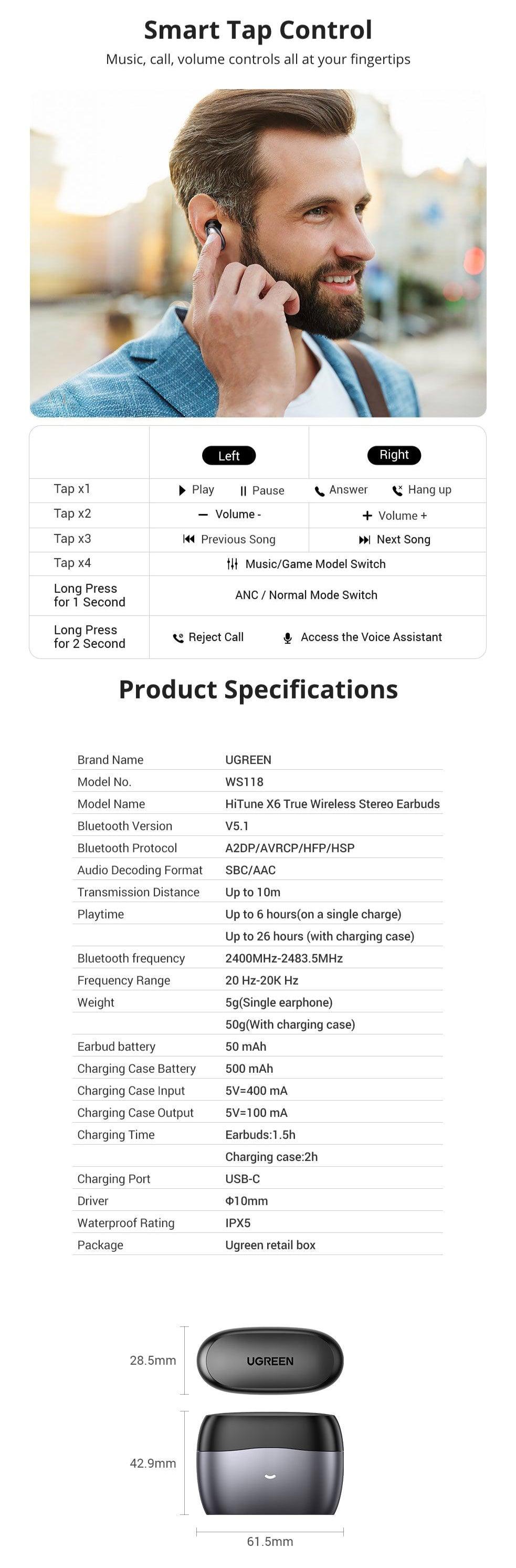 Ugreen HiTune X6 wireless earphones, delivering superior sound with deep bass thanks to their oversized 10mm diamond-like carbon drivers. Experience powerful, dynamic audio that adds fun to your daily routine. These earphones feature six built-in microphones (three per earphone) for exceptional noise cancellation, blocking out ambient noise up to 35dB, keeping you focused wherever you go. Enjoy all-day listening with up to 6 hours in the earphones and 26 hours in the case, and a quick 10-minute charge provides an hour of playback. Comfortable and secure with multiple ear tip sizes. Stay connected and heard clearly with noise reduction technology. Plus, enjoy hassle-free one-step pairing with Bluetooth 5.1 technology.