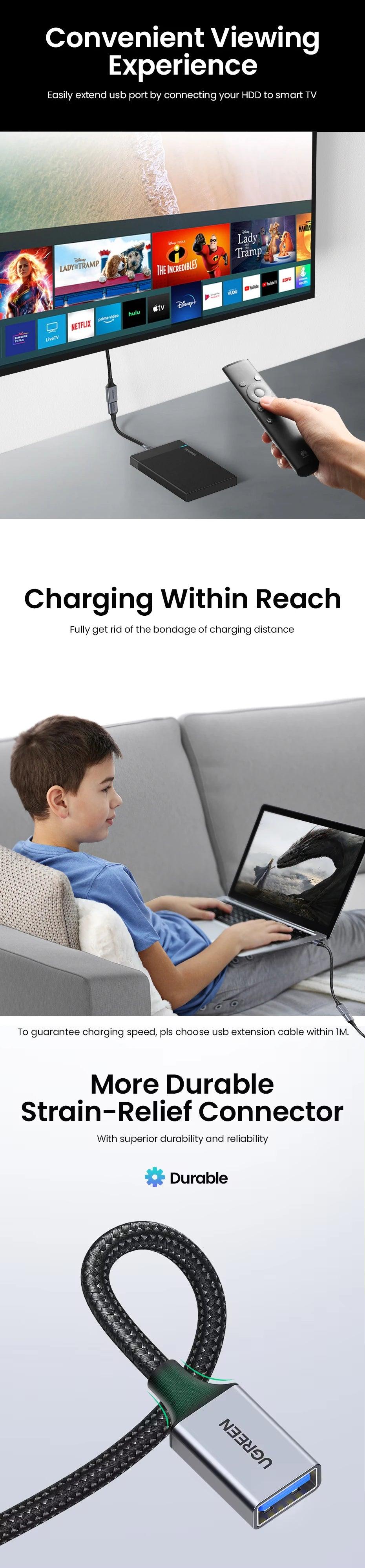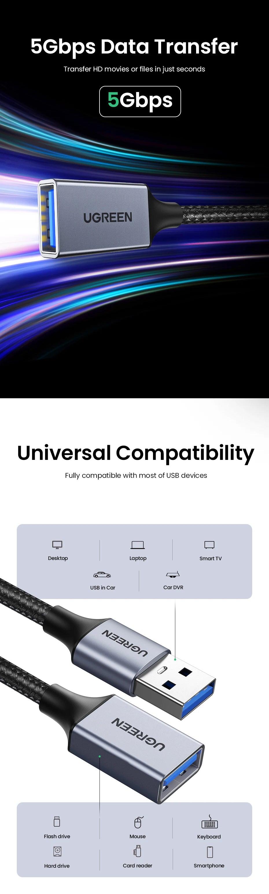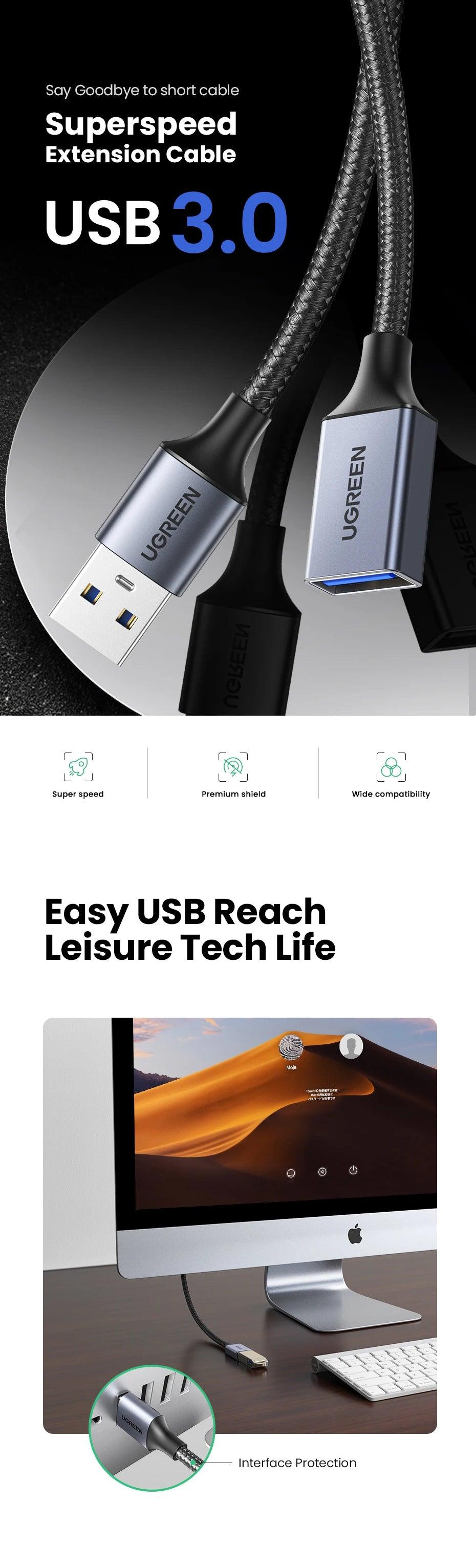 Ugreen USB 3.0 Extension Aluminium Braided Cable Male to Female 5Gbps High Speed Data Extender