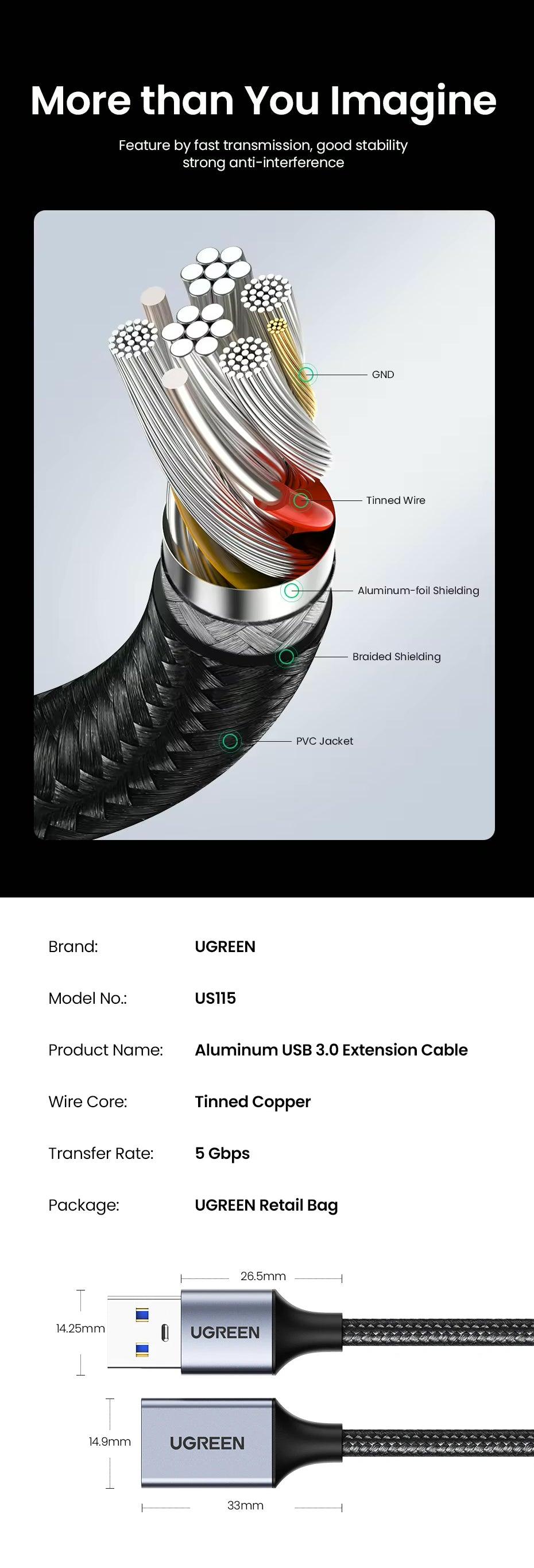 Ugreen Aluminium Braided USB 3.0 Extension Cable, perfect for daily use and office work, eliminating the hassle of short cables. Experience lightning-fast 5Gbps data transfer, 10X faster than USB 2.0, with no latency. Built to last with 15,000+ plug and unplug cycles, three times more durable than standard USB ports. Compatible with various devices including PC, Oculus Rift, PS5, and more. Snug-fitting connectors ensure a secure fit, while nylon braiding makes cables tangle-free and durable. Upgrade your setup today for superior performance and convenience.