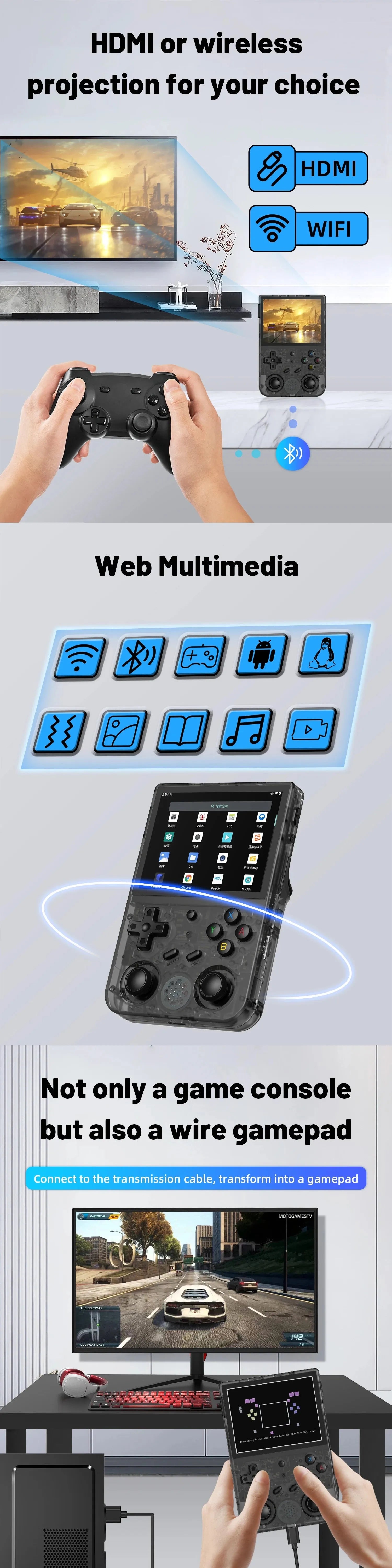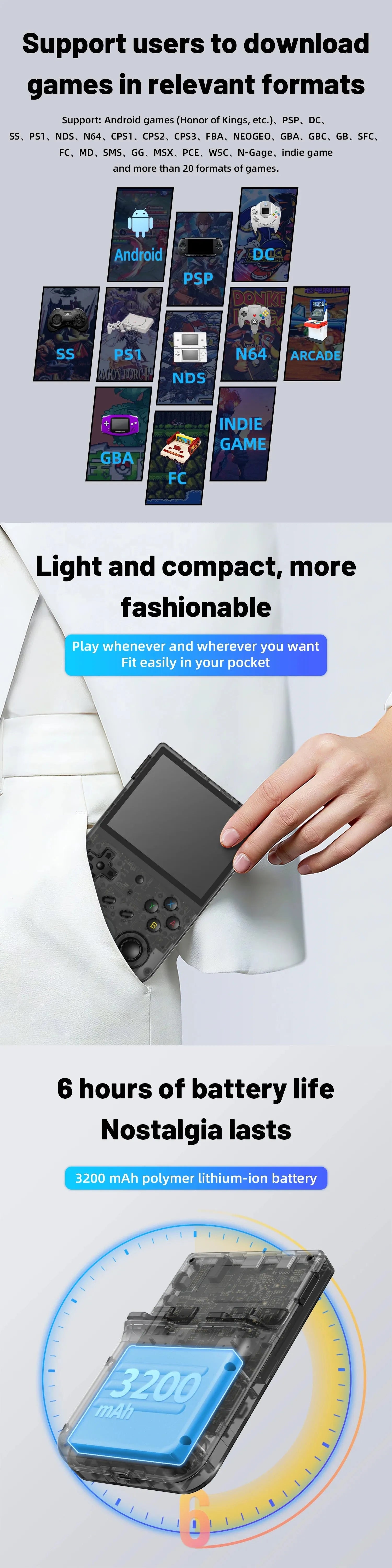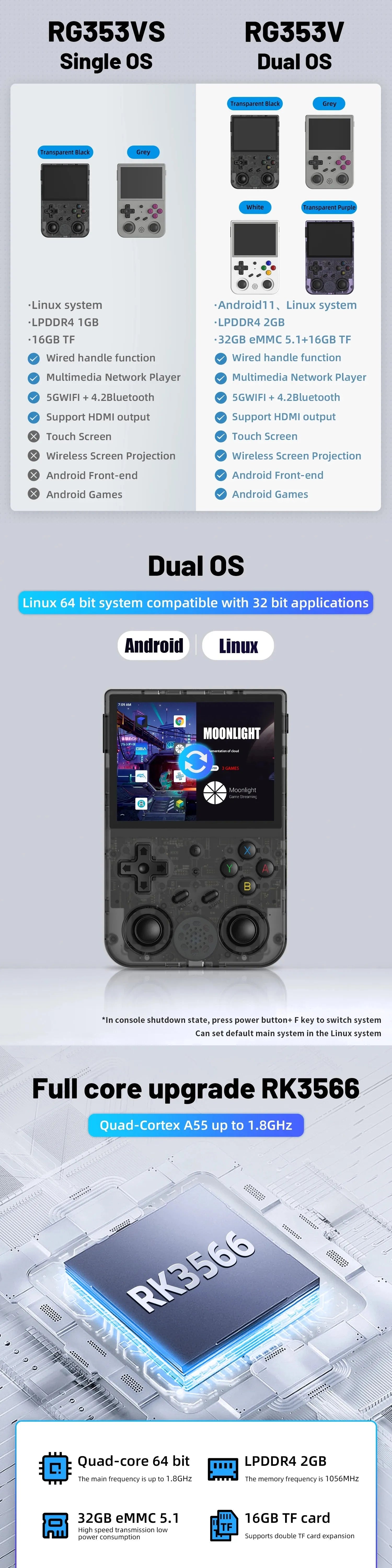 The RG353V Handheld Game Console comes with a 64G TF card, supporting 22 game formats including PS1, GBA, and NEOGEO. It features a 3.5-inch IPS screen with 640x480 resolution for vibrant visuals. The dual Linux and Android 11 system, powered by an RK3566 quad-core processor and 2GB of RAM, ensures smooth gameplay. A 3200mAh battery offers up to 6 hours of use and supports fast charging via USB Type-C. Additional features include WiFi, Bluetooth, HDMI output, and compatibility with wireless and wired joysticks, enabling multiplayer gaming with up to 4 consoles online.