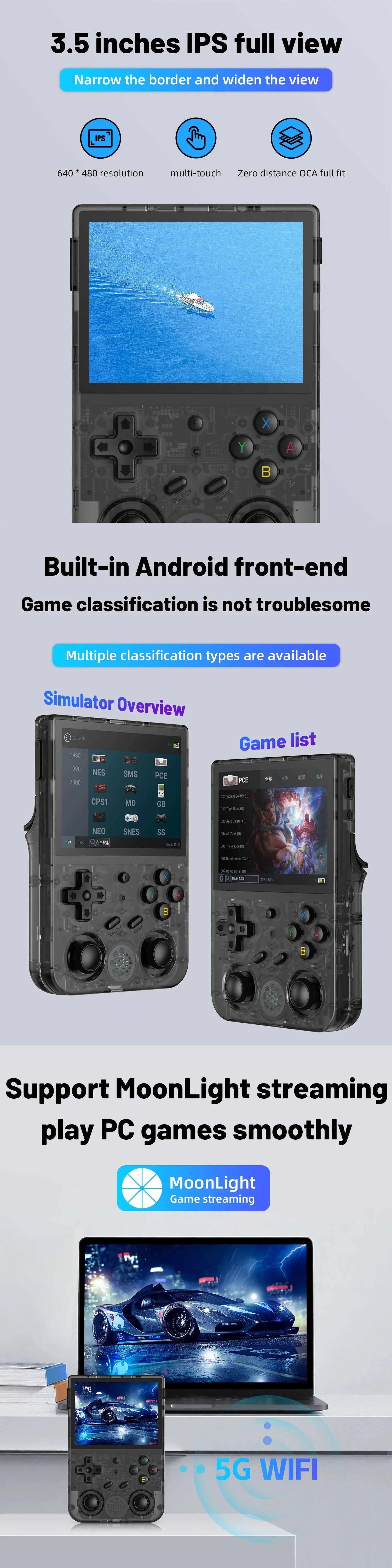 3.5-inch IPS Screen: This handheld game console features a 3.5-inch IPS display with full view angle and OCA fully laminated technology, offering a 640x480 resolution. Enjoy clearer picture quality and more vibrant colours, ensuring a fantastic gaming experience and enhanced eye protection.