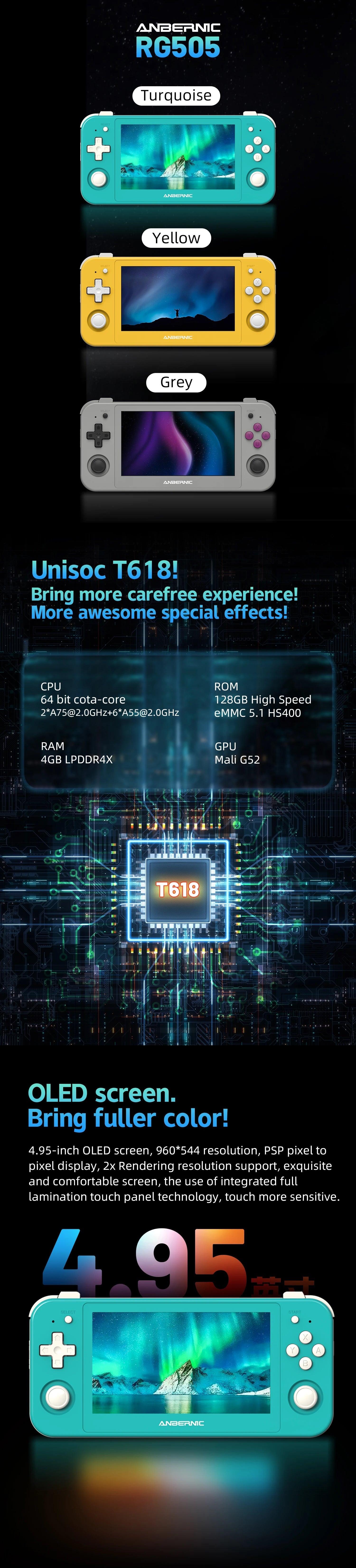 The ANBERNIC RG505 features a 4.95-inch OLED touch screen with a 960x544 resolution, providing PSP pixel-to-pixel display and enhanced eye protection. Running on Android 12 with a 128GB TF card, it supports various formats. It has a 5000mAh battery that charges in 2.5 hours and lasts up to 8 hours. The device supports Moonlight Streaming, HDMI, Hall joystick, 6-axis Gyroscope Sensor, 5G WiFi, OTA updates, and a vibrating motor. The upgraded Unisoc Tiger T618 64-bit CPU ensures low power consumption and high performance with 128GB high-speed eMMC 5.1 HS400 memory for fast system response.