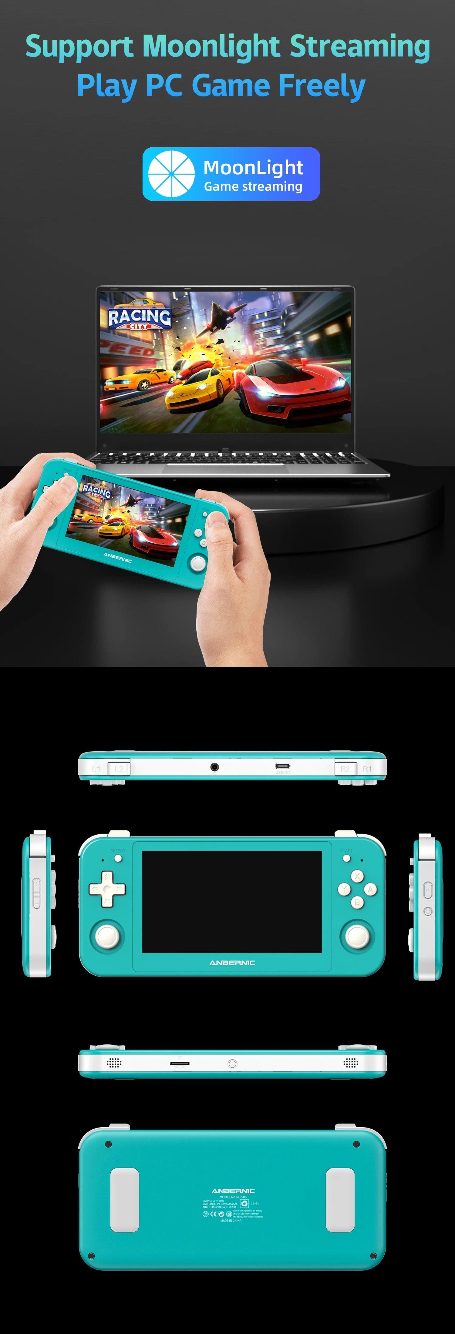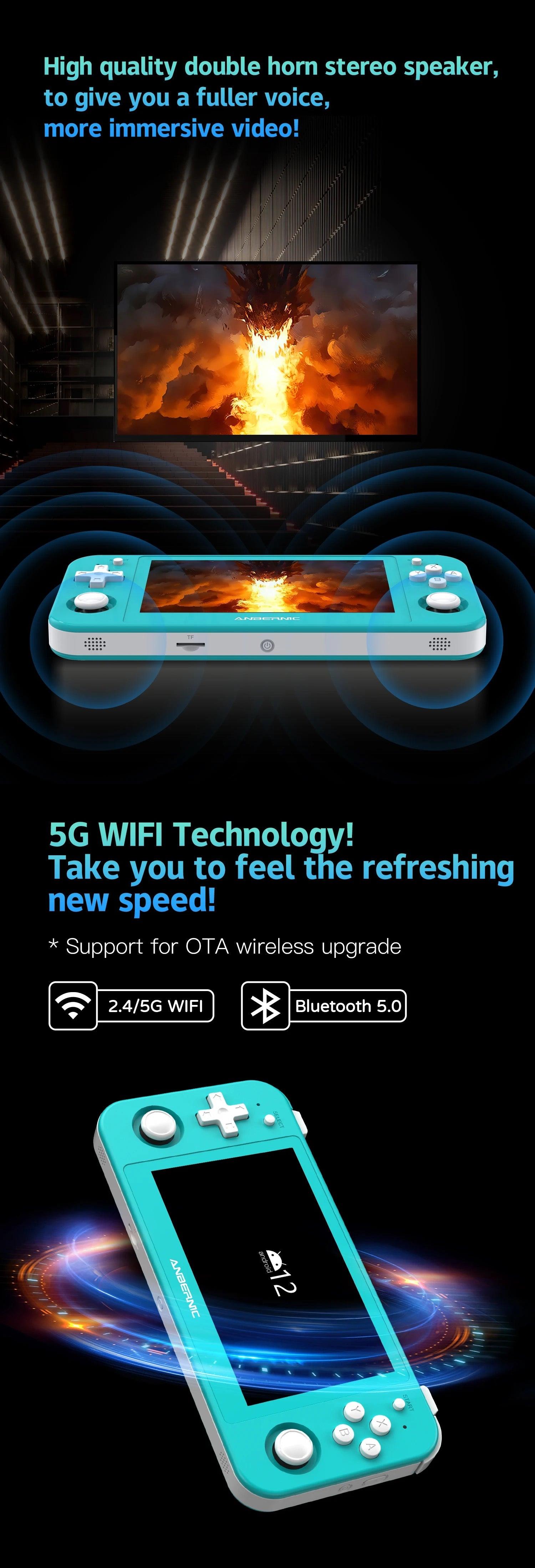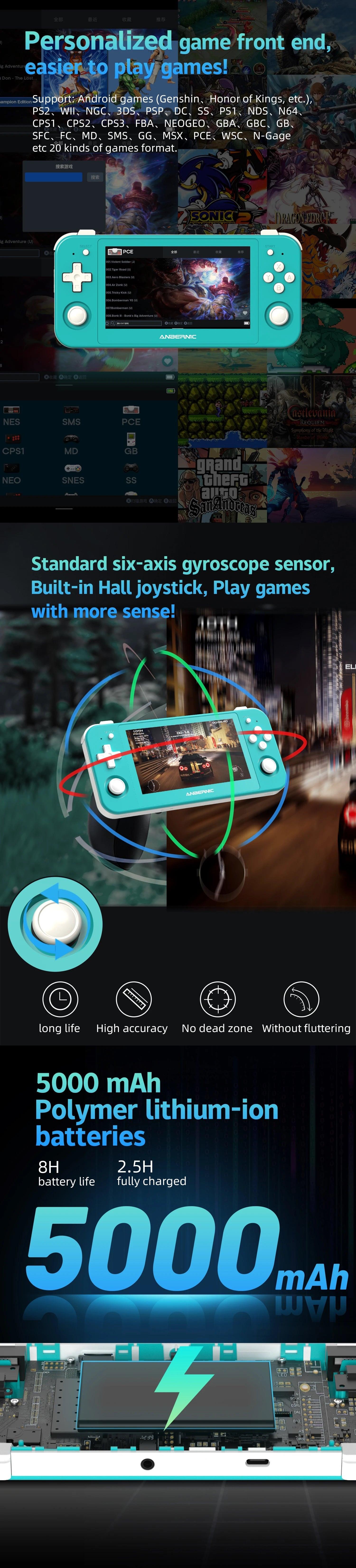 Android 12 System with 128gb TF Card: The ANBERIC RG505 Retro gaming handheld is upgraded with a built-in game front-end launcher. It supports multimedia and network play, is compatible with Android games, and allows users to download games in 20 different formats.