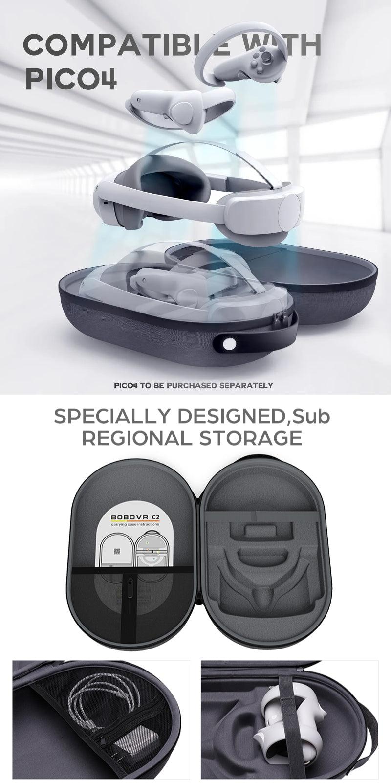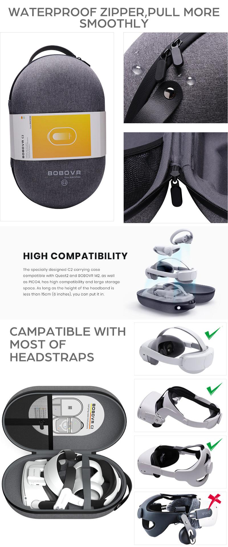 High compatibility and Ample Storage Capacity: The C2 carrying case, meticulously crafted for Quest 2/Pico 4 and BOBOVR M2 Pro, offers outstanding compatibility and generous storage space. It accommodates headbands with a height of up to 15cm (6 inches), including official Elite headbands and various strap styles (please note that it does not currently support DAS straps).
