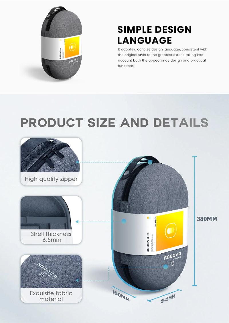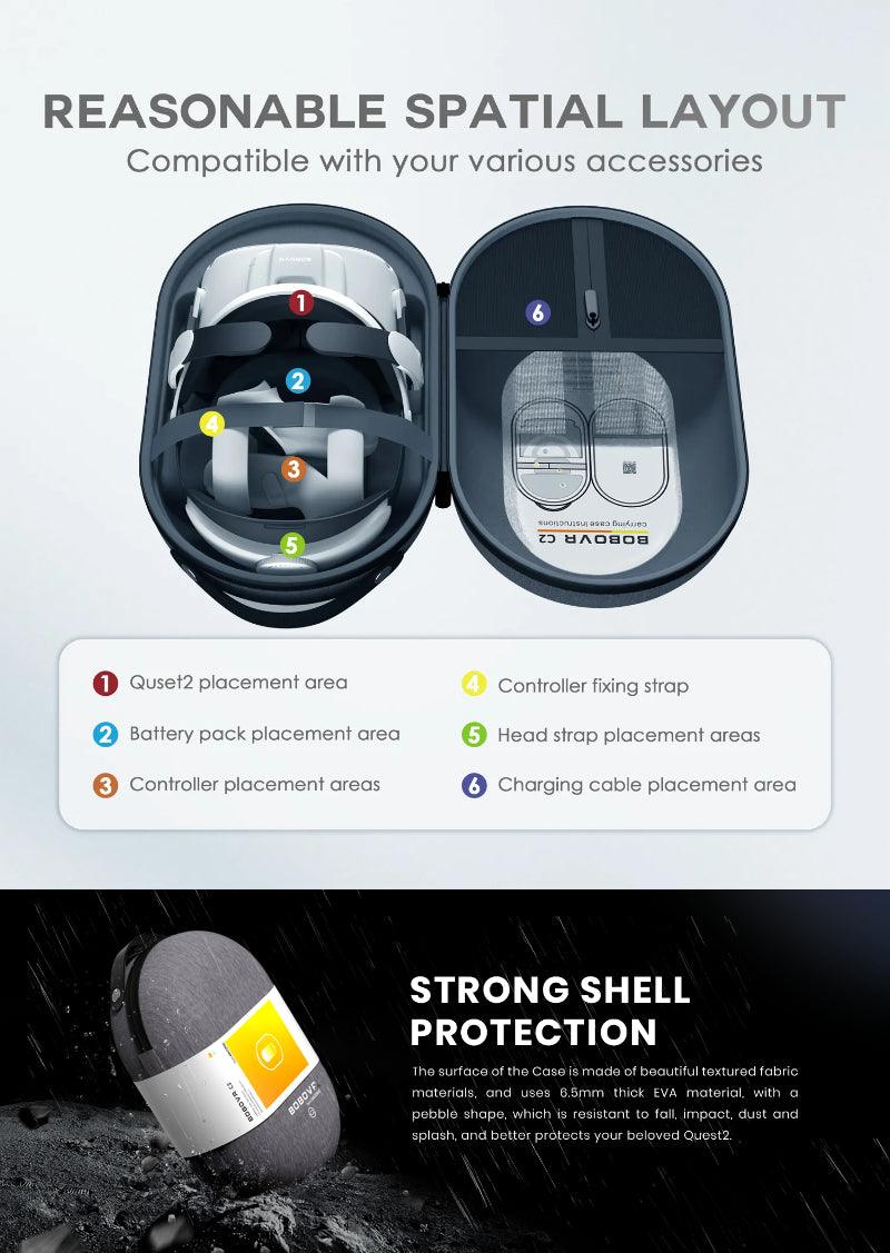 The C2 carrying case is designed for Quest 2/Pico 4 and BOBOVR M2 Pro, offering exceptional compatibility and ample storage. It accommodates headbands up to 15cm (6 inches) in height, including official Elite headbands and various straps (except DAS straps). Inside, it features partitioned storage for Quest 2 and controller with a large head strap, plus a storage bag for cables and charging heads. The case boasts a sleek and minimalist design that complements the original style while prioritising functionality. Crafted from high-quality 6.5mm thick EVA material with textured fabric, it provides superior protection against falls, impacts, dust, and splashes for your Quest 2.