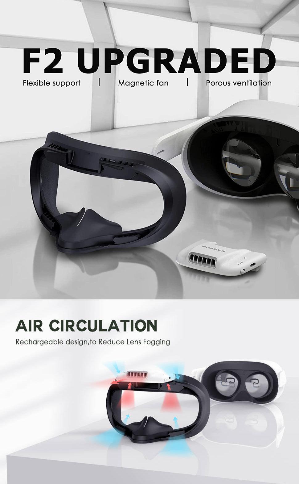 The upgraded F2 ACF is designed to work seamlessly with the Quest 2, enhancing both the comfort and ventilation efficiency of the face interface. Featuring an active ventilation system, it effectively reduces lens fogging and ensures a more comfortable experience for your face.