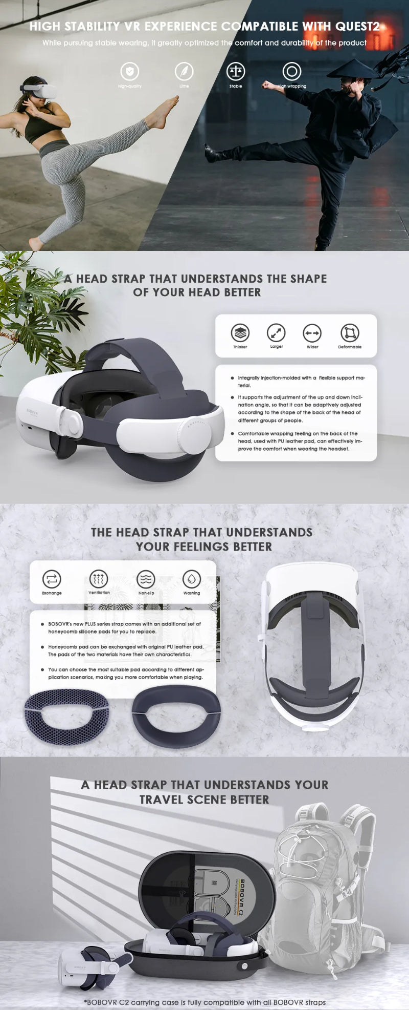 Sports Head Strap: The BOBOVR M1 Plus Sports Head Strap features a front and rear wrapping design, ensuring a secure fit for your Quest 2 headset. Its lightweight construction and effective heat dissipation not only enhance comfort but also help you excel in demanding sports-oriented gaming experiences.
