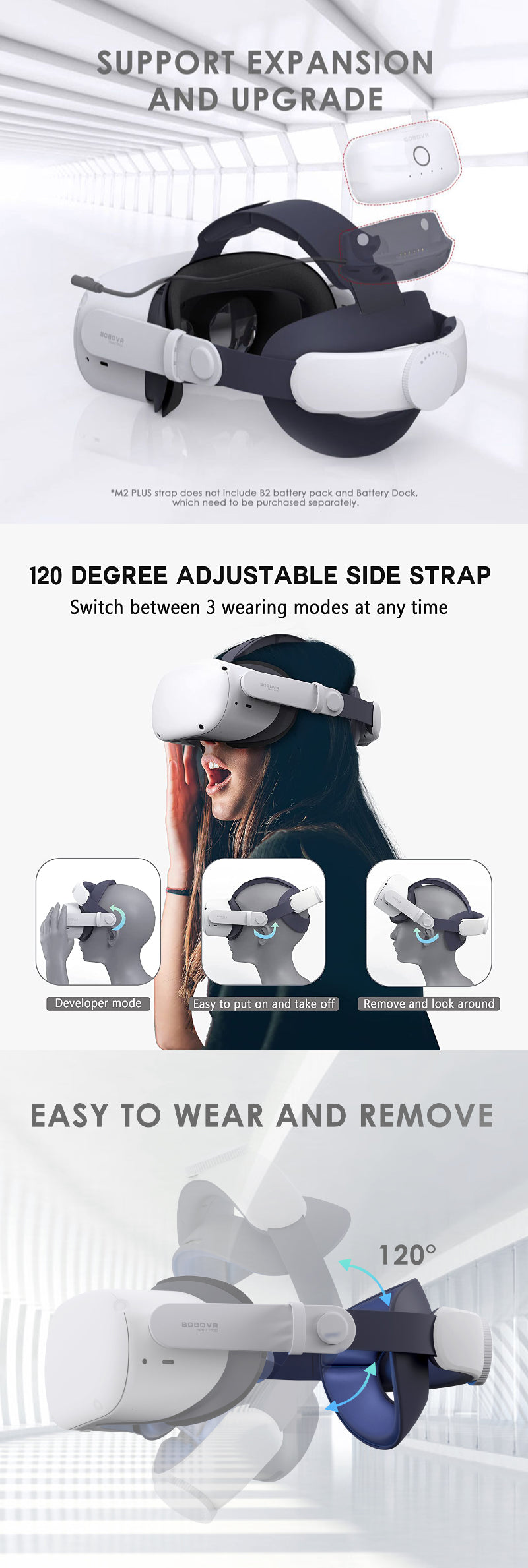 Support Expansion and Enhancement: The M1 Plus strap features a battery expansion port, providing users with a convenient option to enhance their experience by upgrading to a battery strap version using BOBOVR's latest Battery Dock accessory.