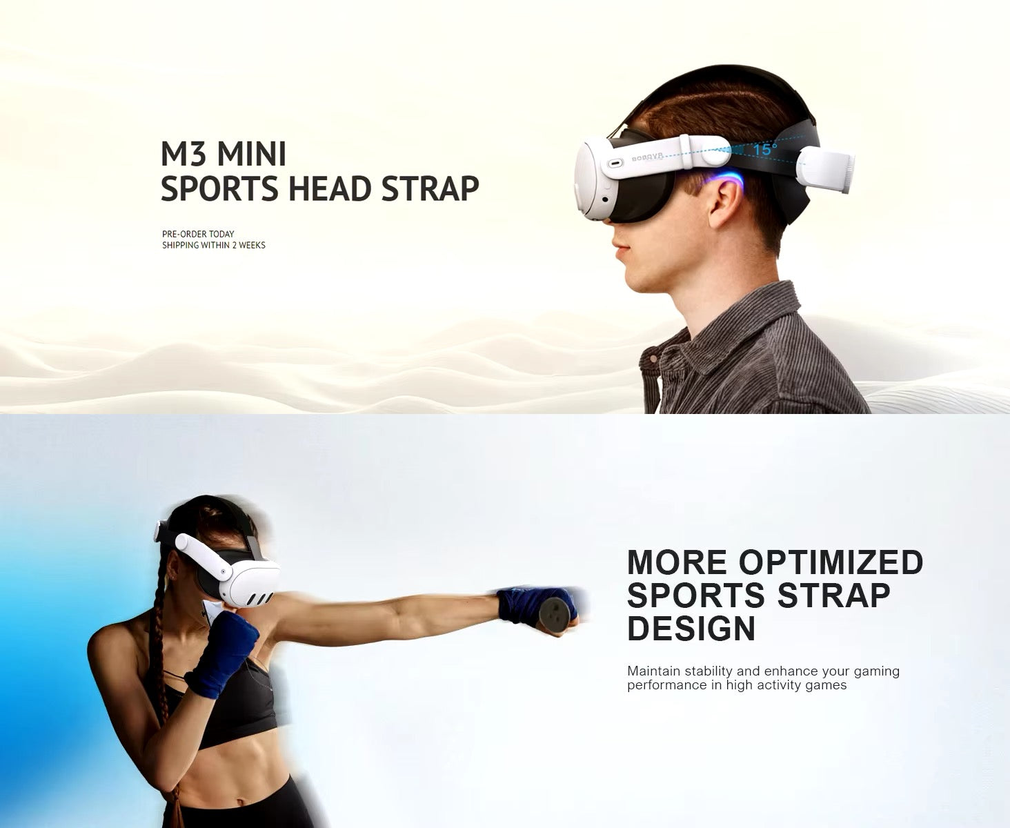 The M3 mini sports strap for Quest 3 is lightweight and compact, featuring durable polymer side straps and a larger, softer support area for comfortable wear on various head sizes. Designed with a 15° bend, it avoids ear pressure for added comfort. Its 120° upward flip makes it easy to wear, especially for glasses users. The strap includes interchangeable honeycomb silicone and PU leather pads, allowing customisation for different activities. Compact and travel-friendly, it fits into most cases and can reduce its volume by 30% via hinge rotation, making it ideal for on-the-go storage.