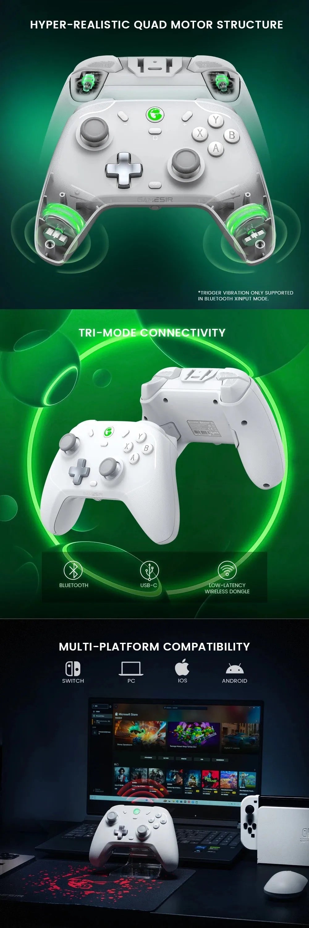 Tri-Mode Connectivity: Tri-Mode Connectivity: The GameSir T4 Cyclone switch controller supports three connectivity options—Bluetooth, Wireless Dongle, and USB-C. Seamlessly switch between devices for a hassle-free gaming experience.