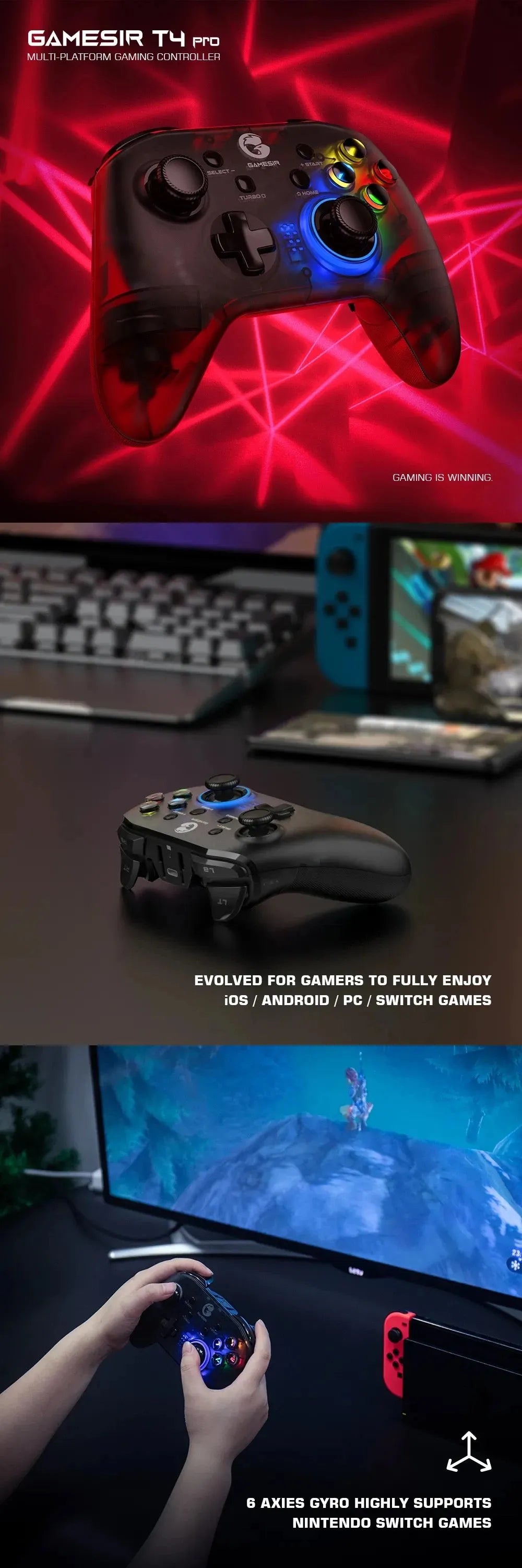 The GameSir T4 Pro wireless controller features vibrant LED backlighting for the ABXY buttons and right joystick, enhancing gaming visuals. It is compatible with PC Windows, Switch, Steam, Android, Android TV, and iPhone, supporting Apple Arcade and MFi games. Connectivity options include Bluetooth, 2.4 GHz receiver, and wired, with Bluetooth only for Switch. The controller offers customisable programmable buttons, a turbo function, and a 6-axis gyroscope for precise control. Dual vibration motors with adjustable intensity enhance gameplay. Its ergonomic, non-slip design ensures a comfortable grip during extended sessions.