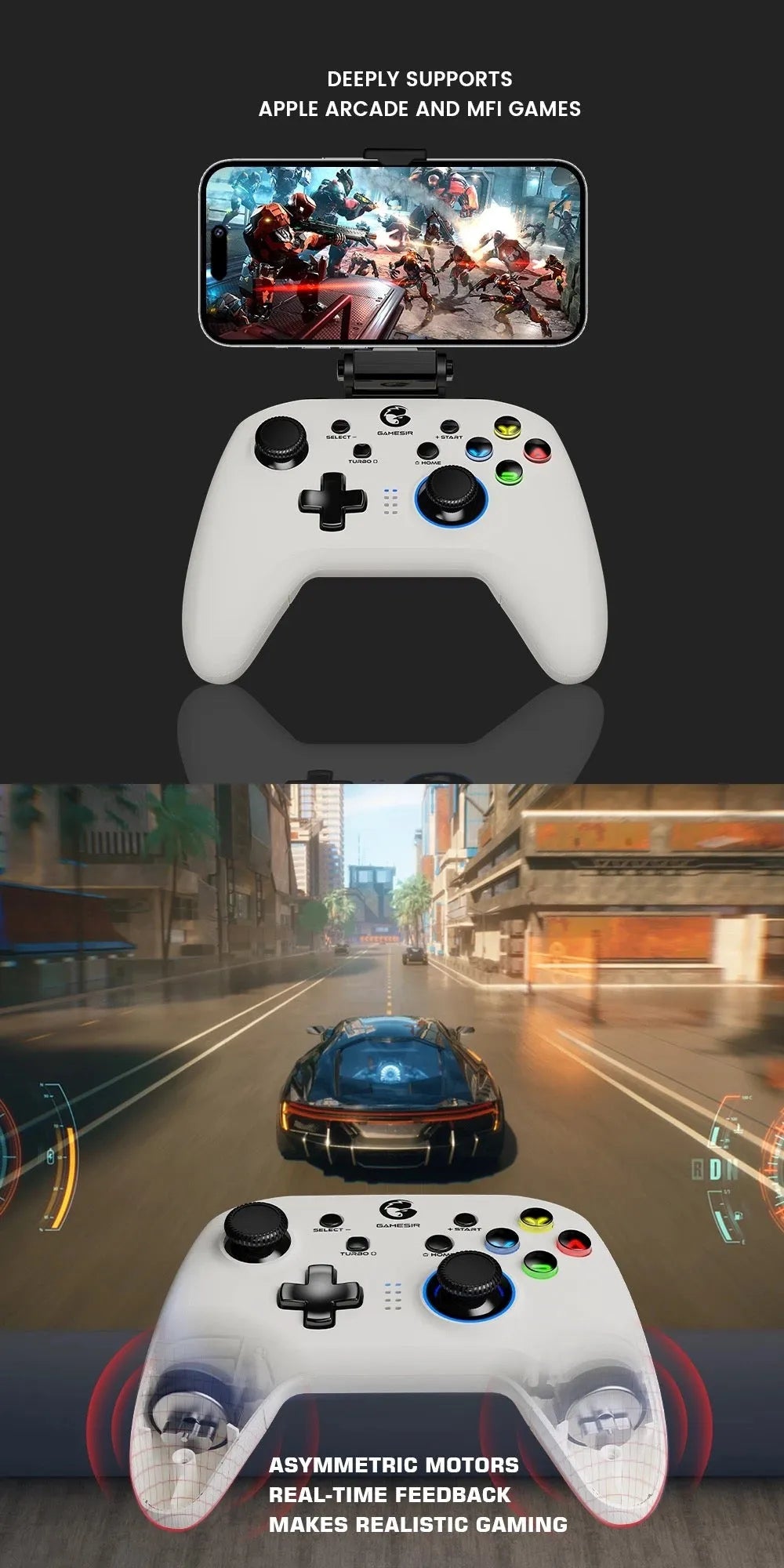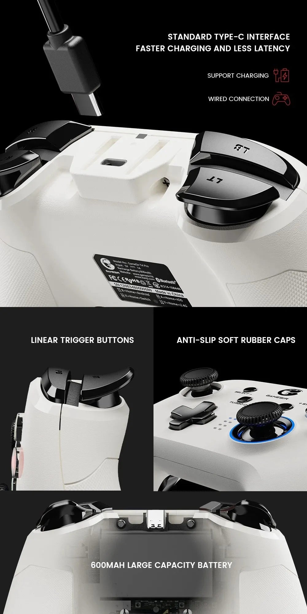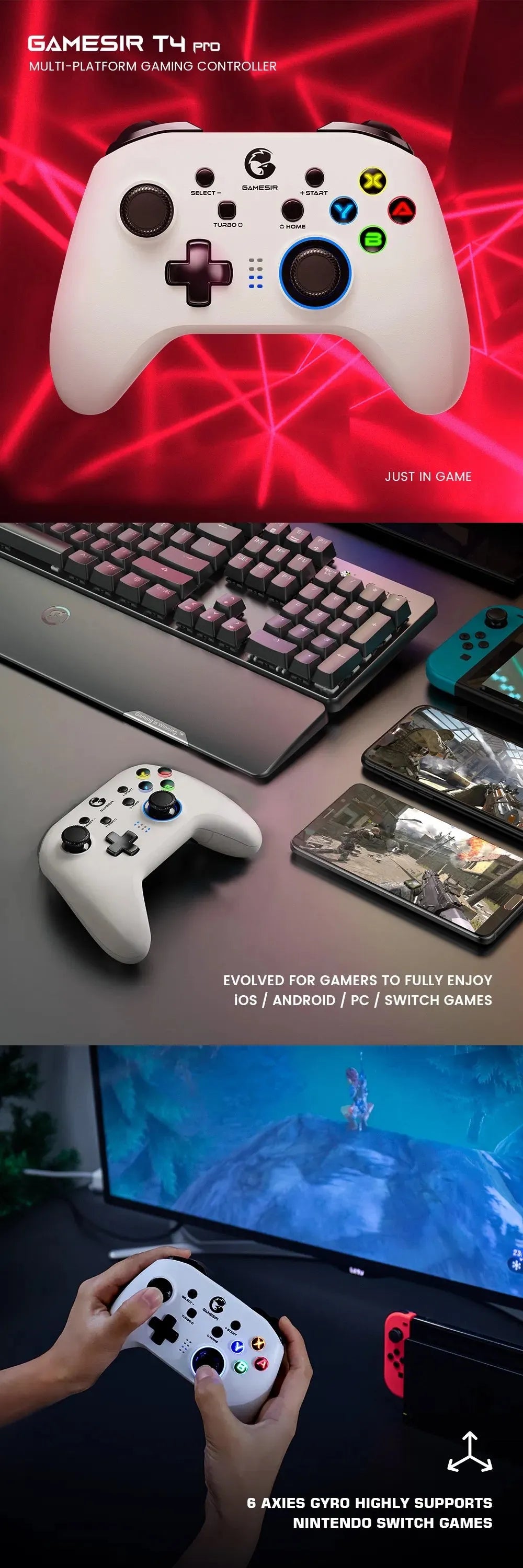 Wide Compatibility: The GameSir T4Pro Gamepad works seamlessly with PC (Windows 10/8/7), Switch, Steam, Android, Android TV boxes, iPhone, and supports Apple Arcade, MFi games, and Switch games. It offers three primary connection methods: Bluetooth, a 2.4 GHz receiver, or wired. Please note that for connecting to the Switch or Switch Lite, Bluetooth is the only supported method.