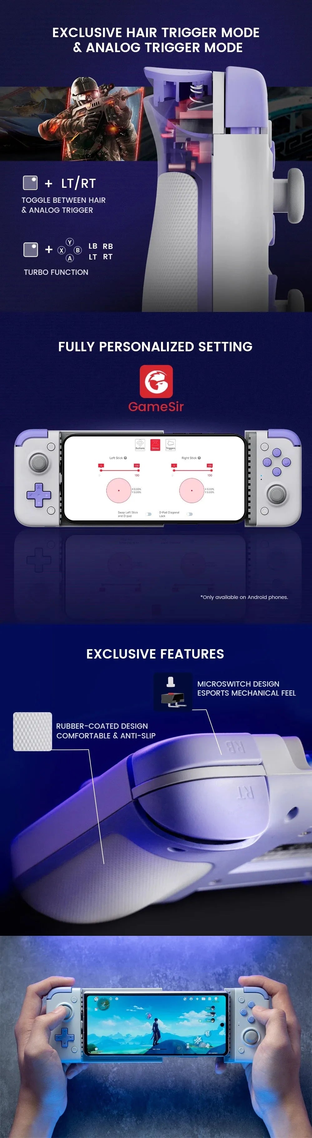 Cutting-edge Hall Technology: Mobile Gaming Controller boasts custom Hall Effect Triggers and sensitive joysticks. The Electromagnetic Induction of the joystick ensures unparalleled smoothness and responsiveness! Designed for FPS and action game enthusiasts, the “Capture” button along with the “+LT/RT” function swiftly toggles to “Hair Trigger” mode, giving players a competitive edge by catching opponents off guard!