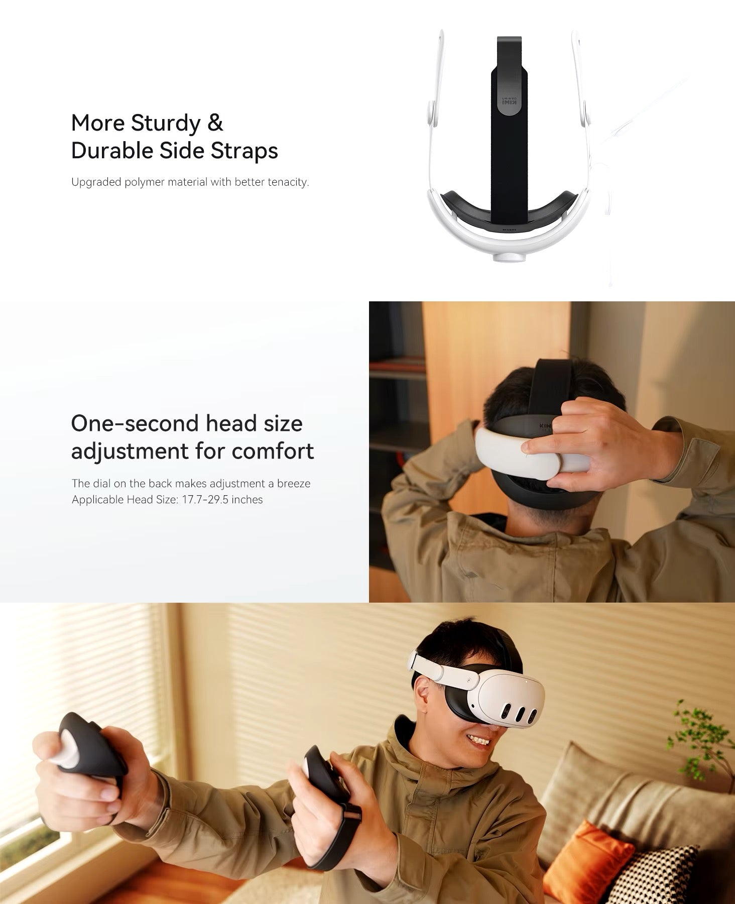 The KIWI design elite strap enhances comfort and stability for the Quest 3S/3, reducing facial pressure for immersive VR experiences. Its unique 52° detachable hinge allows easy flip-up, making it simple to put on and remove. The enlarged bracket accommodates head sizes from 45-75 cm, providing support for long sessions. Memory foam cushions with PU leather surfaces improve comfort and are easy to clean, while the widened top strap pad and thickened head cushion reduce pressure. Tested to endure over 10,000 bending cycles, the strap is highly durable, ensuring long-lasting performance without risk of failure.