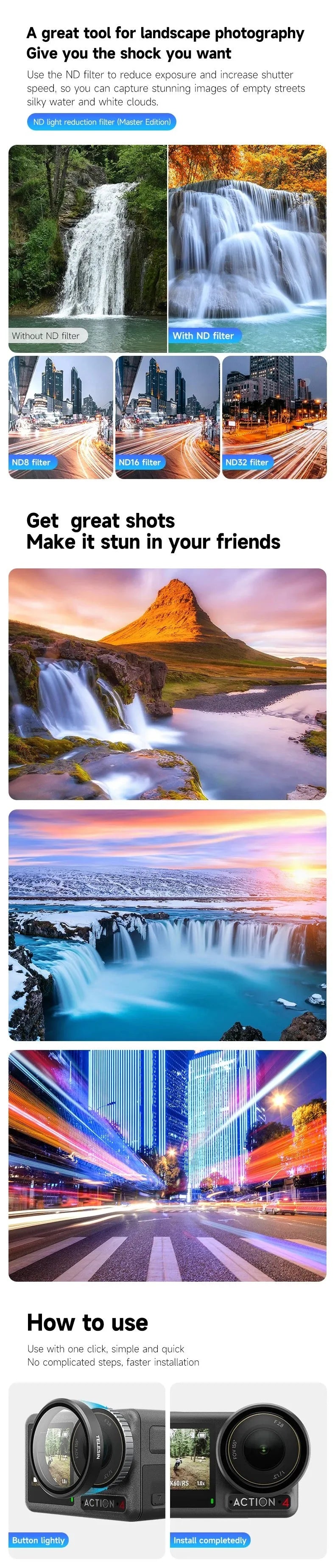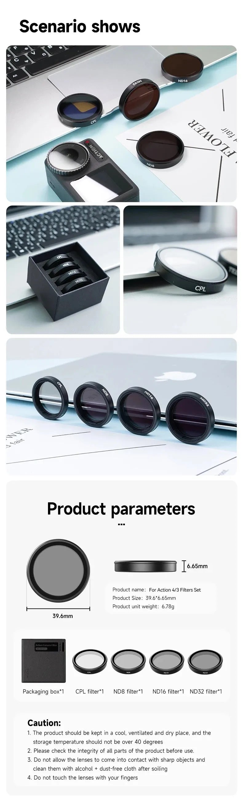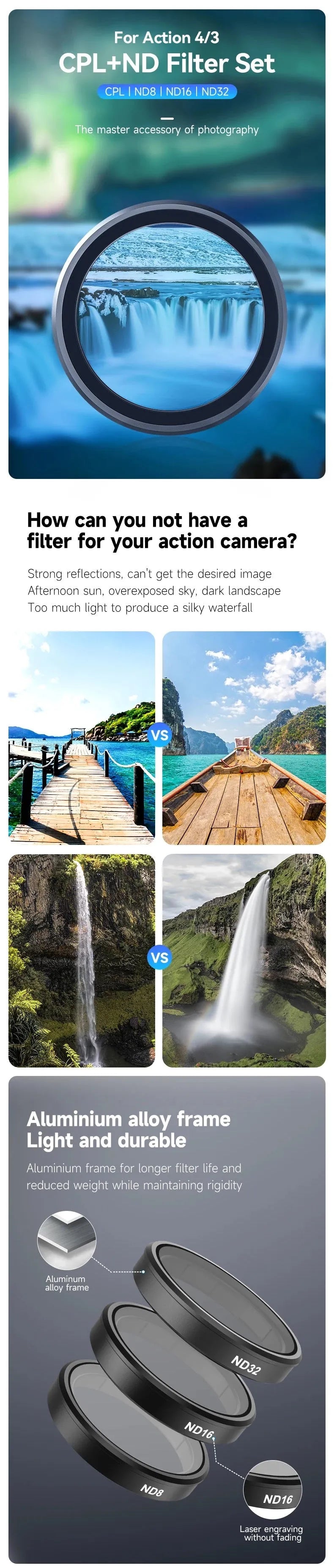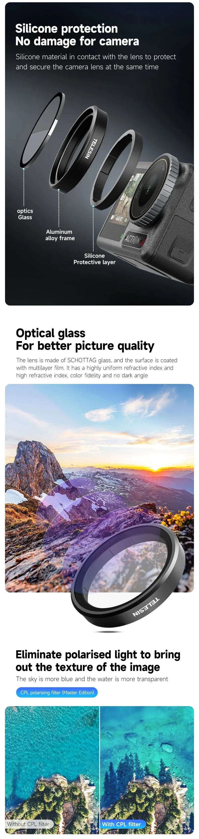 The TELESIN CPL + ND8 + ND16 + ND32 Lens Filter Kit is designed for DJI OSMO Action 5 Pro, Action 4, and Action 3 cameras. Made from high-quality multi-coated optical glass, it offers over 99.5% light transmittance for clear, vivid images. The ultra-thin design prevents vignetting, while the CPL filter reduces reflections and enhances color saturation for rich landscapes. ND filters allow creative control over aperture, exposure, and sensitivity, reducing light intake to avoid overexposure in bright conditions. This kit ensures better contrast and vibrant colors in photos and videos, making it ideal for professional outdoor shooting.