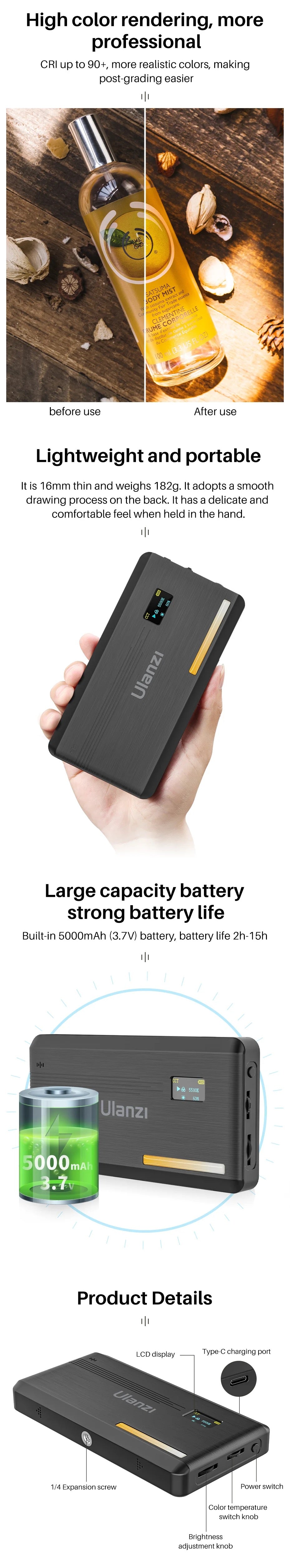 Long-Lasting 5000mAh Battery – Designed for Extended Use: Never worry about running out of power mid-shoot! The built-in 5000mAh high-capacity battery offers a runtime of 2 to 15 hours, depending on your brightness settings. It’s a perfect companion for travel vlogging, on-the-go shoots, or any long-duration project where portability and reliability matter most.