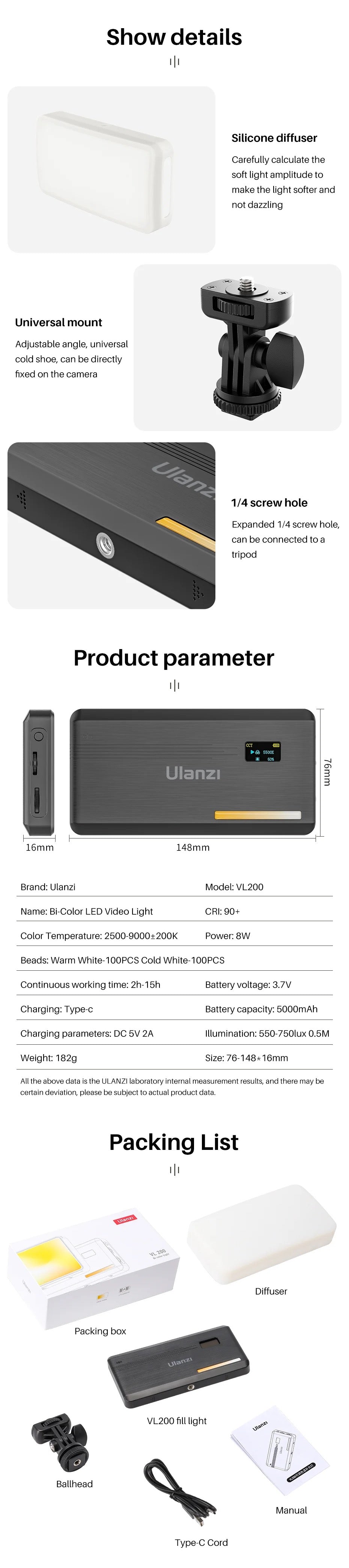 Ulanzi VL200 Bi-Colour LED Video Light, USB-C Rechargeable 5000mAh