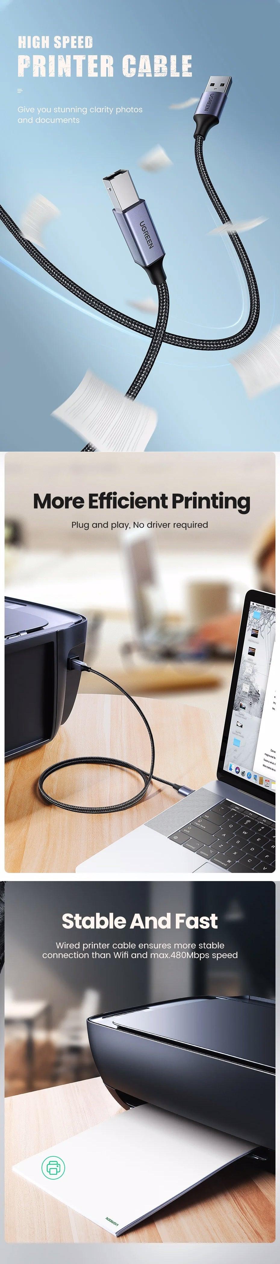 USB Printer Cable: The Ugreen USB A to USB B printer cable offers seamless connectivity for USB Type B printers, scanners, fax machines, digital pianos, and multi-function printers like Epson, HP DeskJet/Envy, Lexmark, Dell, Brother, and 3D printers to laptops, computers (Mac/PC), or any other USB-enabled devices. It's a simple plug-and-play solution, requiring no additional drivers.