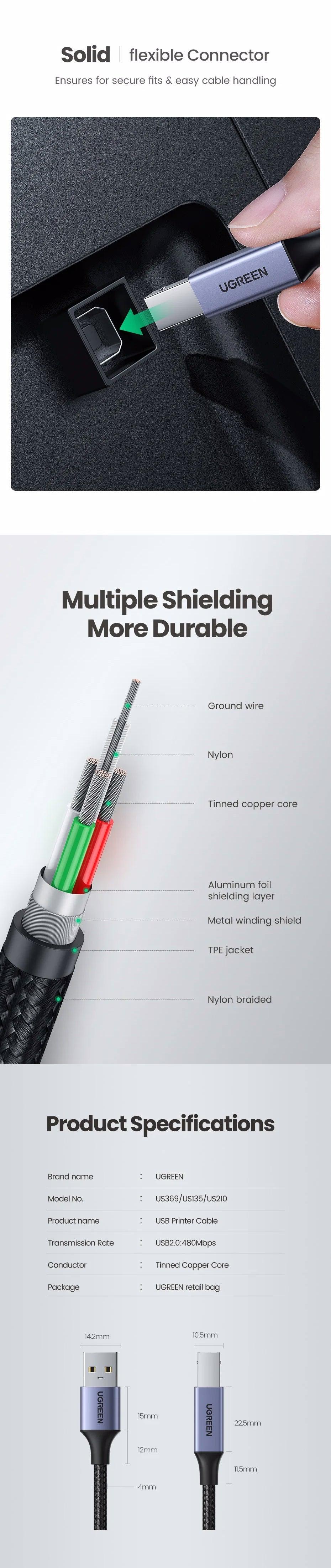 Durable Braided Cable: Ugreen USB A to USB B printer lead crafted with an aluminium alloy shell and a tangle-free, high-density braided cable. It has undergone rigorous testing, with over 3000 bends to ensure high bending strength and excellent toughness. Equipped with an 11.5mm reinforced joint and nickel-plated connectors, it enhances oxidation resistance and durability, making it sturdier than many other options on the market.