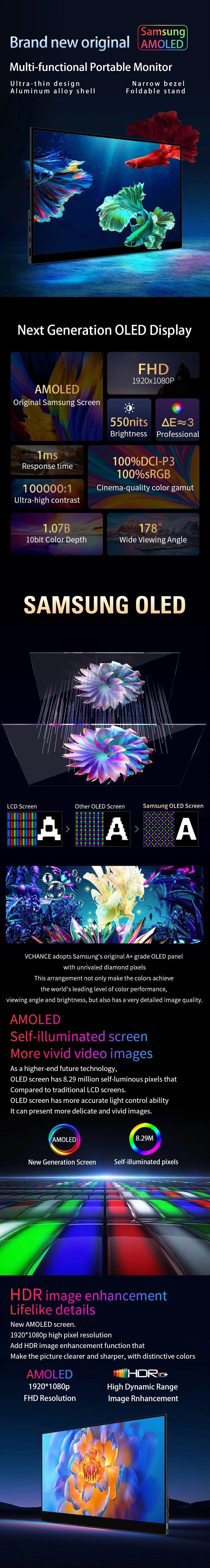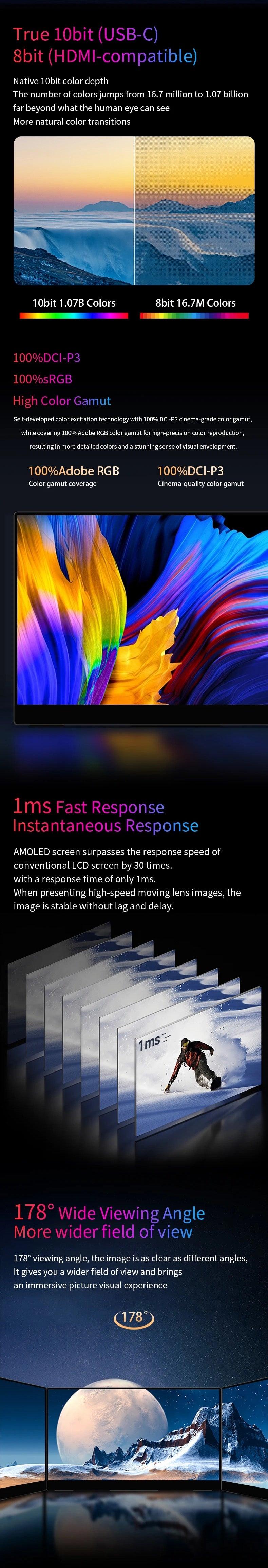 Sleek Design: This OLED portable monitor boasts ultra-thin bezels that expand the screen's display area. The full-black aluminium alloy casing with a built-in kickstand not only lends the monitor a premium and stylish aesthetic but also offers exceptional durability and effective heat dissipation, thereby enhancing overall performance stability.