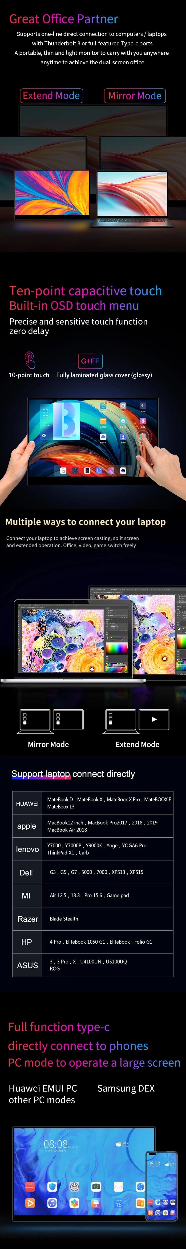 10-Point Touch: Touch Screen 10-point touch and pinch to zoom gesture is precise and sensitive, fingertip sliding, simple and precise, no extra driver needed. NOTE: To realise the touch function, there must be a USB C to A or USB C to C cable connected to the USB C data port on the monitor to your device directly.