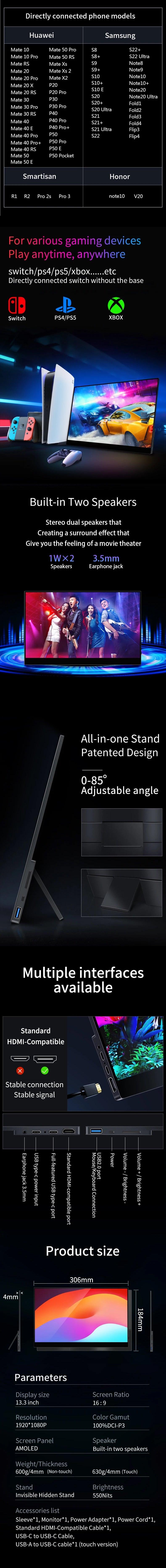 13.3-inch OLED Portable Monitor Touch Screen FHD 1920x1080 60Hz HDR