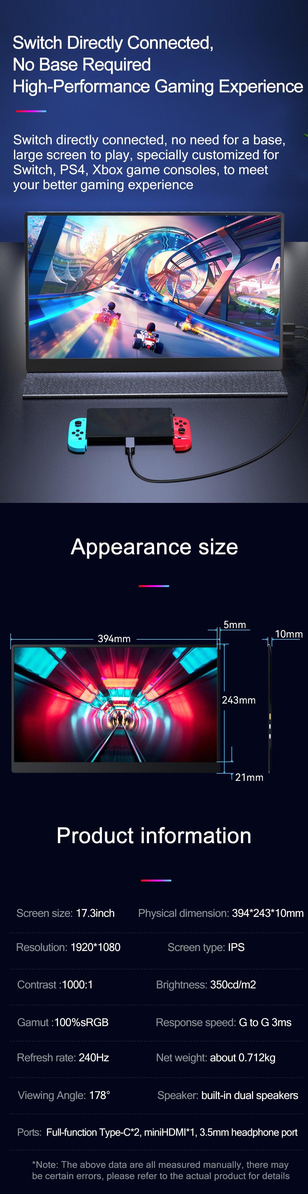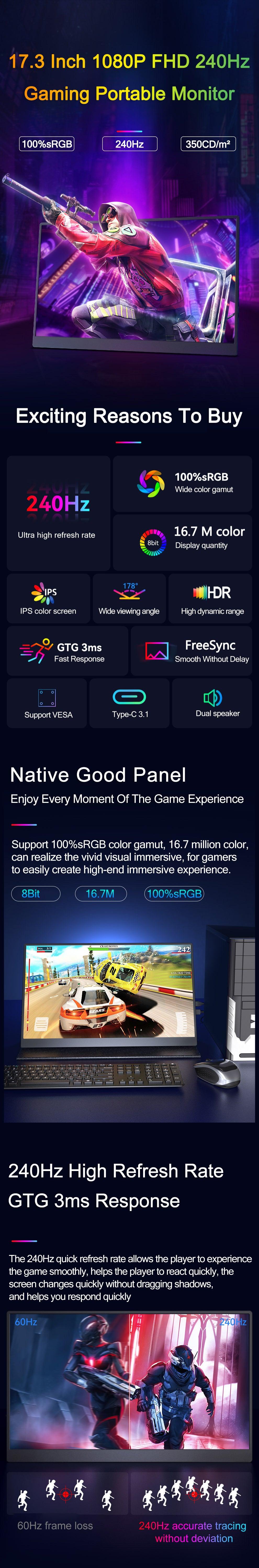 240Hz 17.3-Inch Gaming Portable Monitor HDR IPS 1920x1080