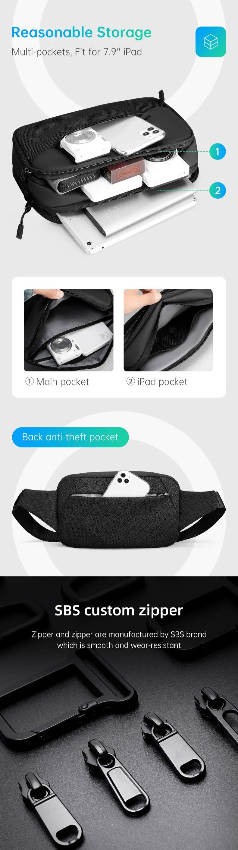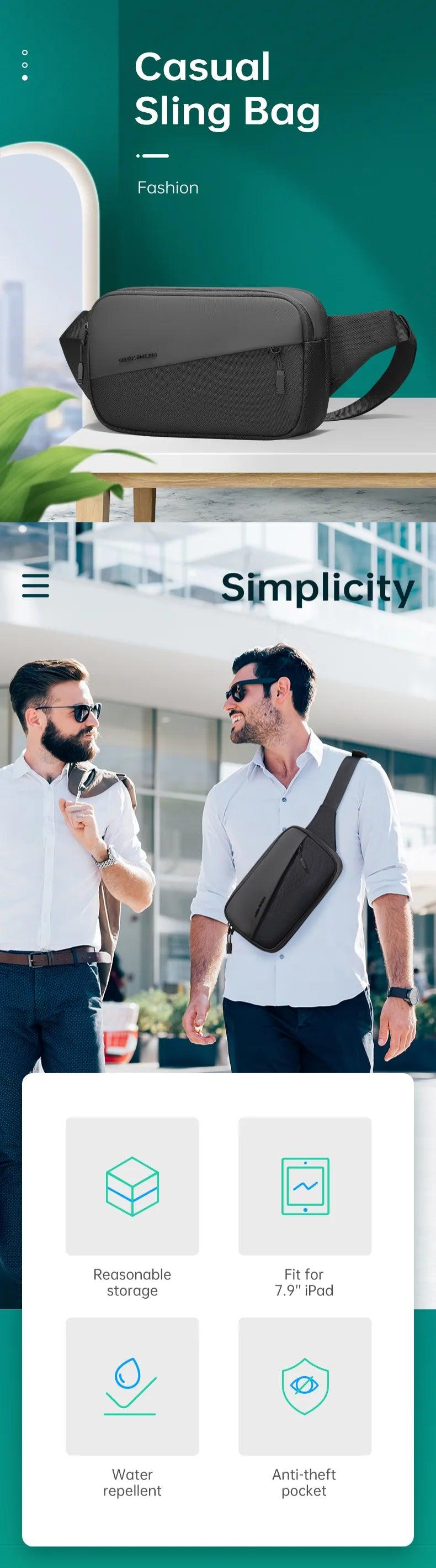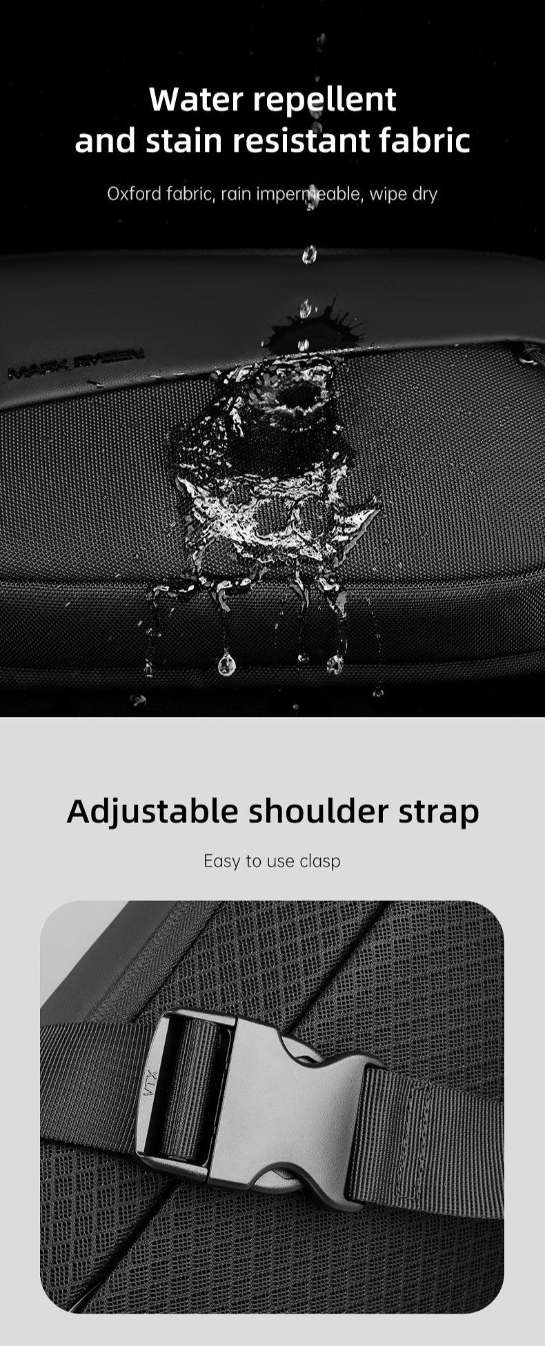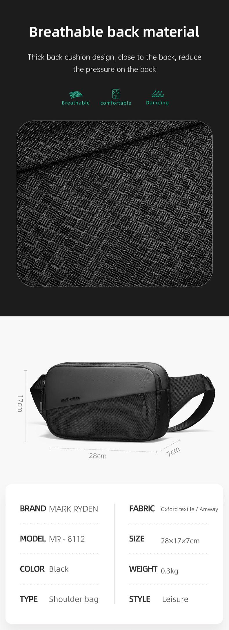 The Mark Ryden shoulder bag is a durable and waterproof companion made from high-quality water-resistant Oxford cloth, featuring premium SBS zippers for lasting reliability. Its lightweight design is easy to carry, and the breathable mesh padding on the back ensures all-day comfort. This chest bag offers multiple storage pockets for convenience, with a front pocket for small items, a spacious main compartment suitable for a 7.9-inch iPad, camera, power bank, and notebook, along with additional small and back security pockets. It's the perfect blend of toughness and comfort for your daily needs.
