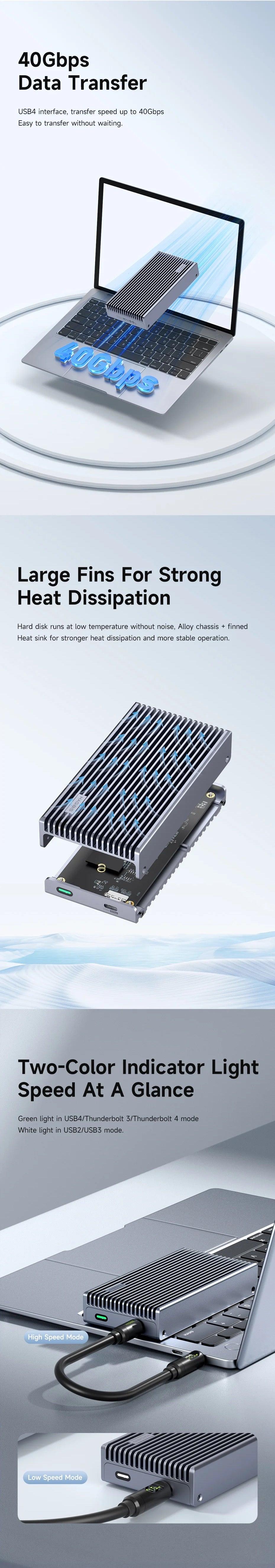 Large Alloy Fins Design: The Hagibis USB4 M.2 SSD Case features an alloy body and a finned heat dissipation plate, ensuring the SSD operates at low temperatures. This design eliminates fan noise, enhances heat dissipation, and promotes more stable operation.