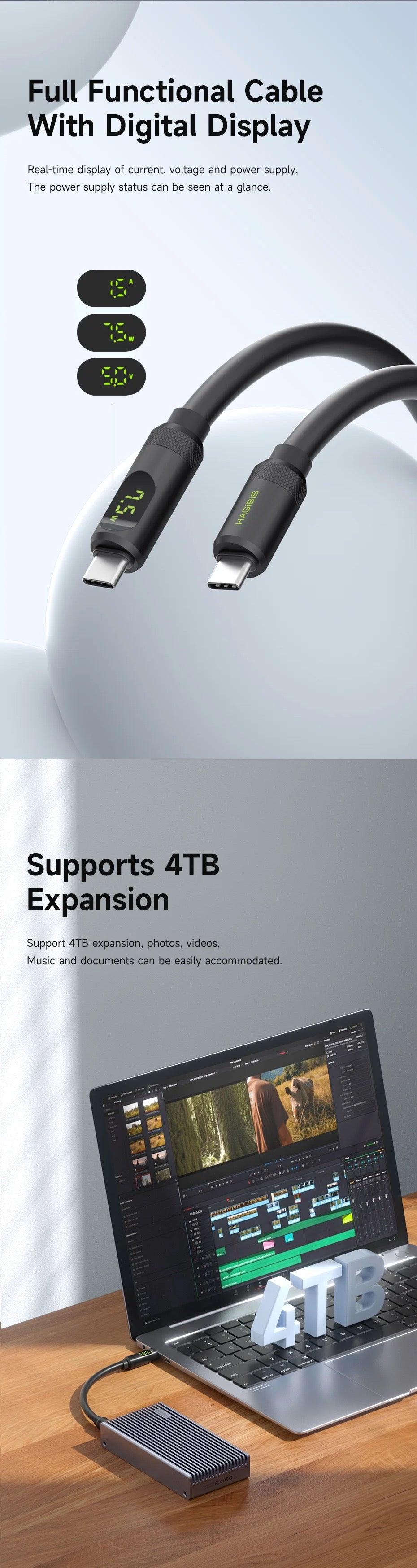 Included USB4 LED Display Cable: The Hagibis MC40 package features a 40Gbps 240W 8K@60Hz USB4 LED Display Cable. This real silicone flexible cable shows real-time current, voltage, and power supply, making the power status easy to see at a glance.