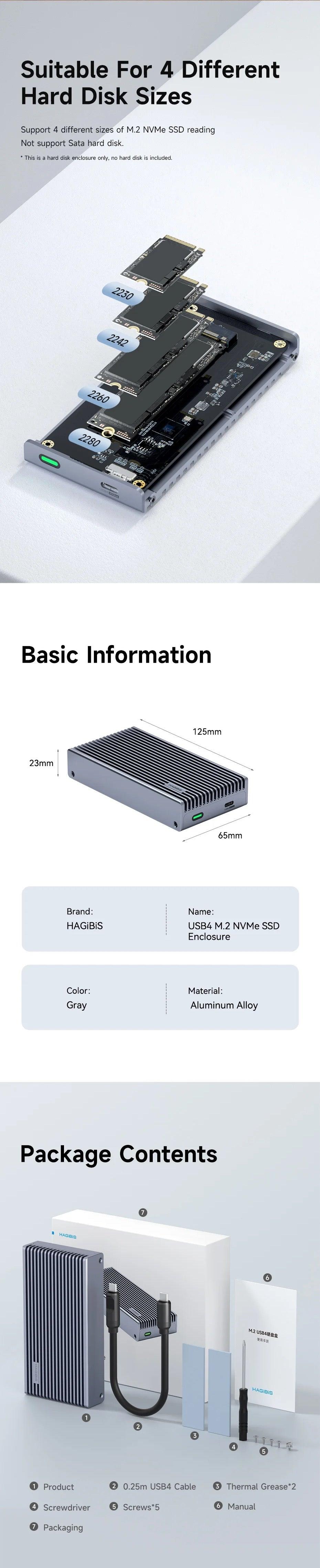 Extensive Compatibility: The Hagibis ASM2464PD M.2 enclosure supports M.2 PCIe3.0x4 NVMe M Key and NVMe B+M Key in sizes 2280/2260/2242/2230, with capacities up to 4TB. It is not compatible with M.2 SATA SSDs, M.2 PCIe AHCI SSDs, or M.2 PCIe devices. This enclosure works with multiple operating systems, including Windows, Mac OS, Linux, and Android. It is plug-and-play, requiring no drivers or power supply. *Note: This is an SSD enclosure only and does not include any NVMe SSDs.
