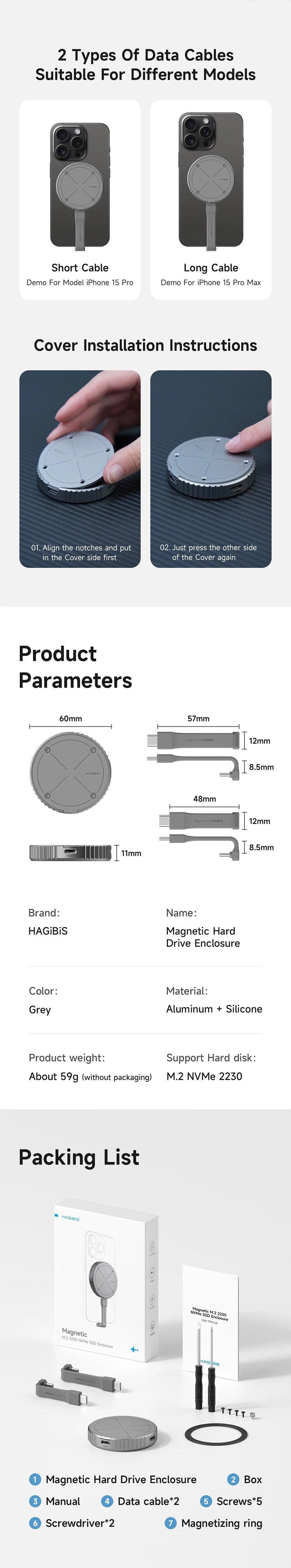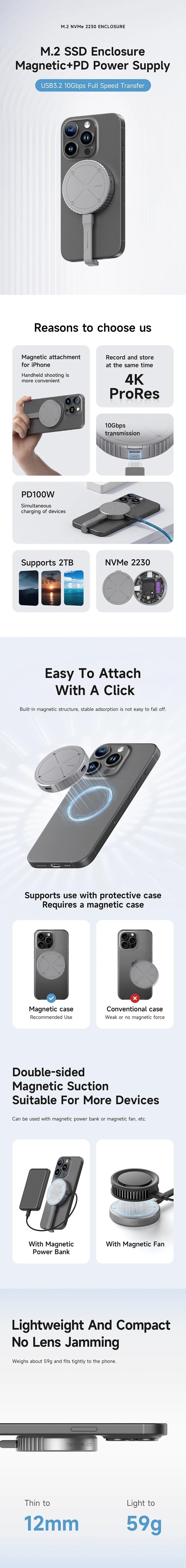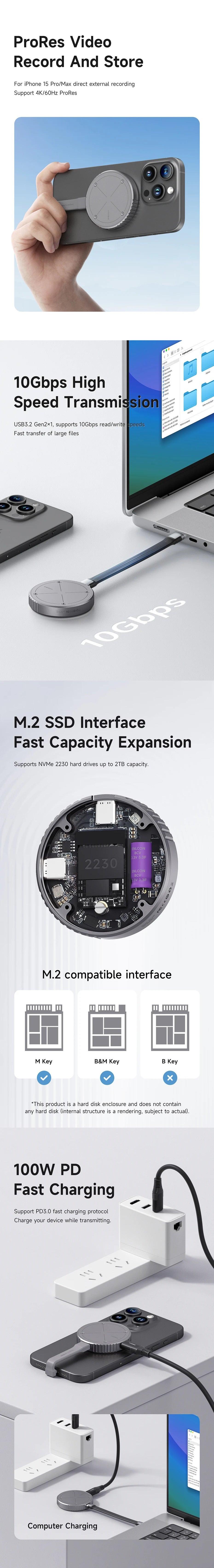 The Hagibis M.2 2230 NVMe SSD MagSafe enclosure, perfect for expanding storage. Compatible with NVMe SSDs, it boasts a 10Gbps USB3.2 Gen2 Type-C interface for seamless plug-and-play convenience. Featuring a magnetic suction structure, it securely holds SSDs and even accommodates MagSafe phone cases. With direct storage for iPhone 15 Series ProRes videos, it eliminates transfer delays and memory concerns. Dual power outage protection ensures data security, while delivering blazing-fast 10Gbps transmission speeds. Supporting up to 2TB capacity and offering wide compatibility with Type-C devices, it's the ultimate solution for data transfer and backup needs.