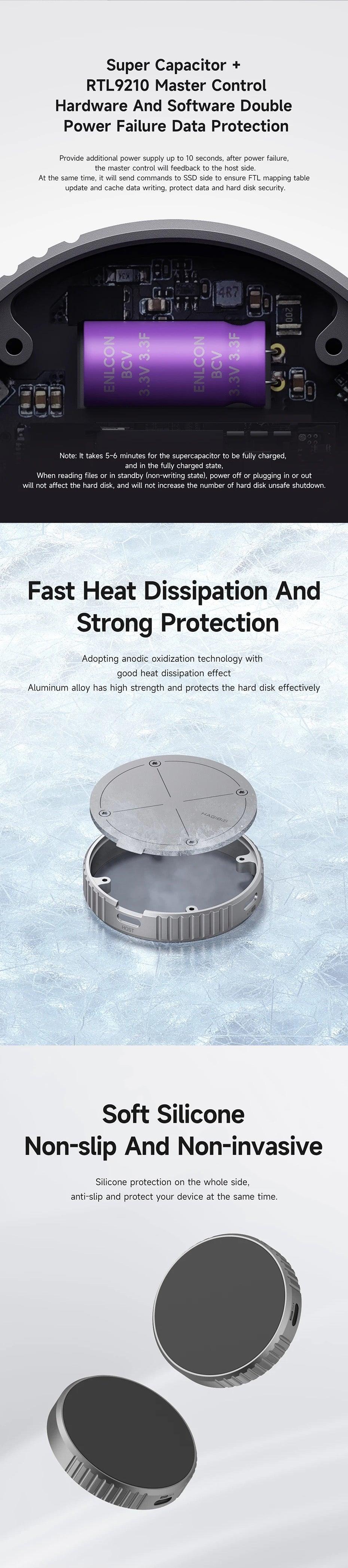 Dual Power Outage Protection: Equipped with both a supercapacitor and RTL9210 main control, this system offers dual software and hardware safeguards against power interruptions. It extends power supply for an additional 10 seconds during outages. Following a power loss, the main control communicates with the host end, instructing the SSD end to update FTL mapping tables and write cache data, ensuring data and hard disk security. Please Note: The supercapacitor takes 5-6 minutes to fully charge. Once charged, it doesn't affect hard drive operations during file reading or standby mode (excluding write mode), power off, or unplugging, thus preventing an increase in unsafe shutdowns.