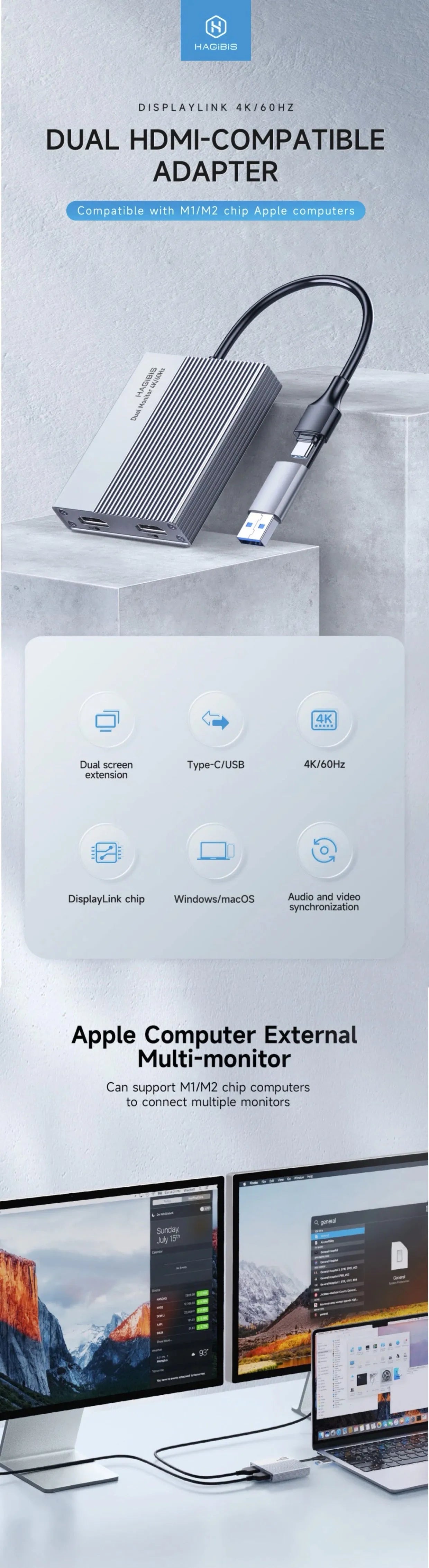 Hagibis Dual HDMI Displaylink Adapter for Apple Mac M1 to M4 Chip USB C to Dual Monitor