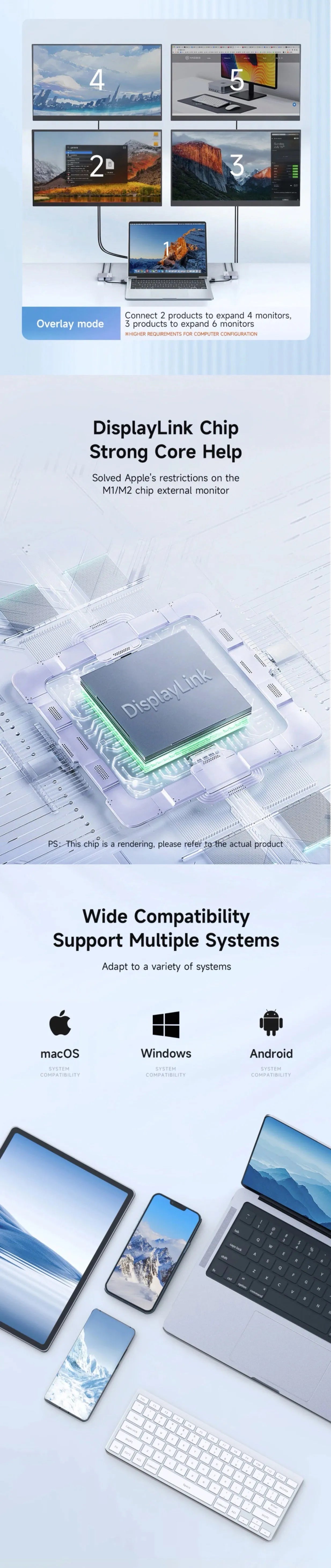 Wide Compatibility: Compatible with various operating systems, including macOS, Windows, Android, and more. Note: Before using this product, please download and install the driver from the DisplayLink website.