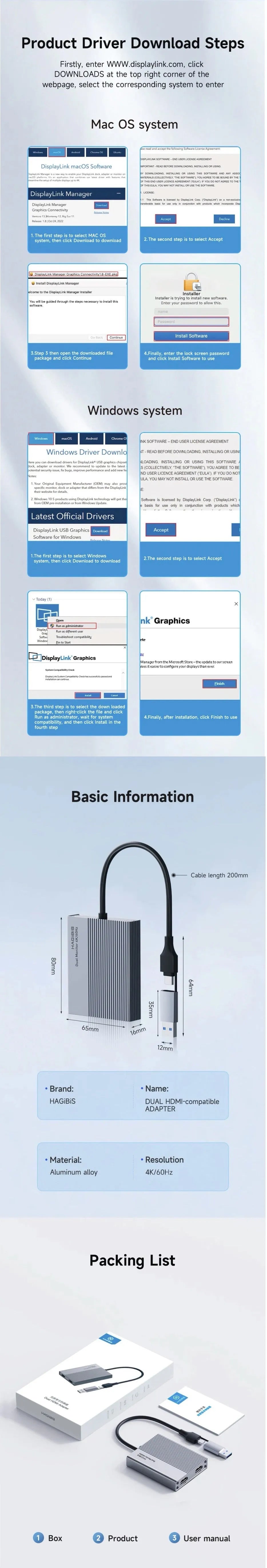 The Hagibis Dual HDMI Adapter enables dual 4K@60Hz displays via USB-C or USB 3.0 inputs. Supporting Mirror and Extended modes, it enhances productivity by allowing simultaneous or distinct displays. Powered by the DisplayLink DL6950 chip, it ensures stable performance on Mac (including M1/M2/M3/M4 Macs), Windows, and Android devices. Each HDMI 2.0 port delivers true colour reproduction and synchronised audio-video transmission. Compatible with various operating systems, users must install the DisplayLink driver for optimal functionality. Ideal for work or entertainment, this adapter is a powerful solution for seamless dual-monitor setups with vivid visuals and versatile connectivity.