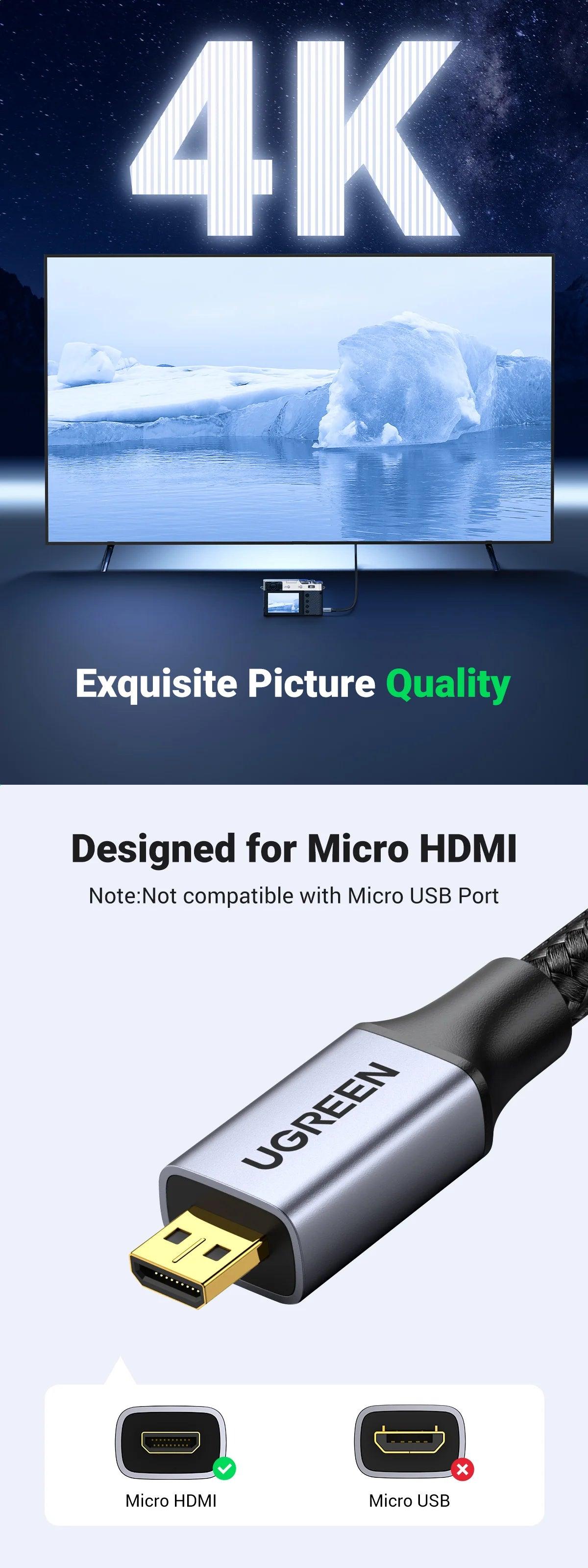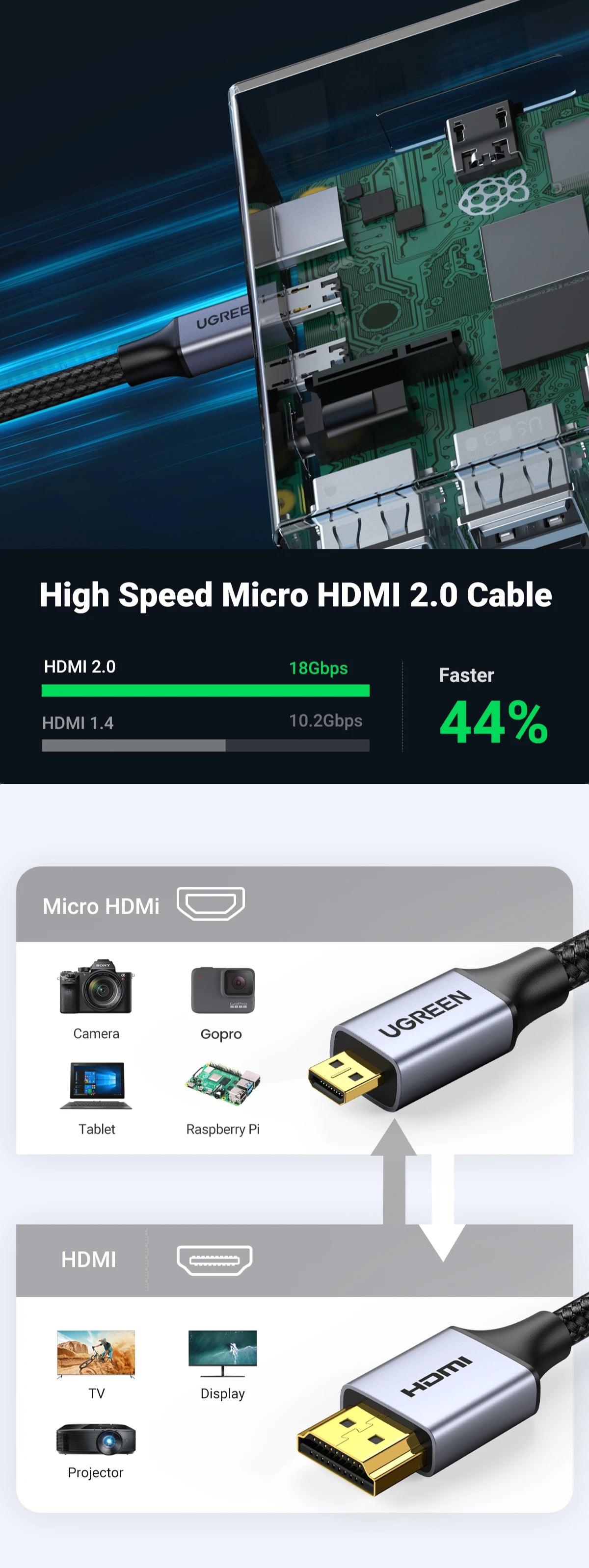 4K Micro HDMI to HDMI Cable: Ugreen's Micro HDMI Cable delivers impressive performance, adhering to the HDMI 2.0 standard. It enables Ultra High Definition (UHD) resolution of up to 4K at 60Hz (3840x2160p), while also being backward compatible with resolutions like 2K at 1440P at either 144Hz or 60Hz, 3840x2160 at 30Hz, 1080P at either 120Hz or 60Hz, and 1280x720 at 60Hz. With an expanded bandwidth of 18Gbps, this cable ensures smooth transmission of both video and audio signals without any buffering. Whether you're gaming or streaming content, you'll enjoy an immersive visual and audio experience, fully appreciating the high-definition content on your screen.