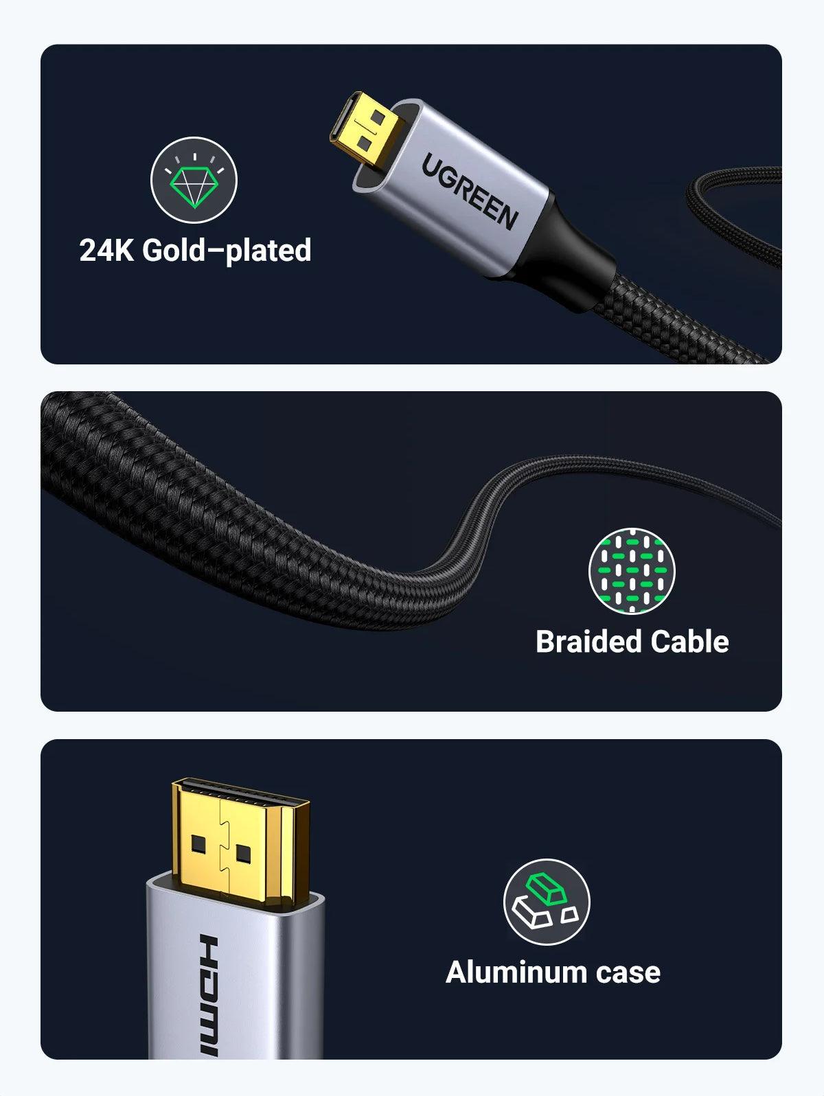Enhanced Material: The Ugreen Micro HDMI to Standard HDMI Cable is crafted to deliver exceptional performance. Featuring gold-plated connectors, aluminium shells, and a braided jacket with strong shielding, this cable safeguards the signal from interference, ensuring pristine picture and sound quality.