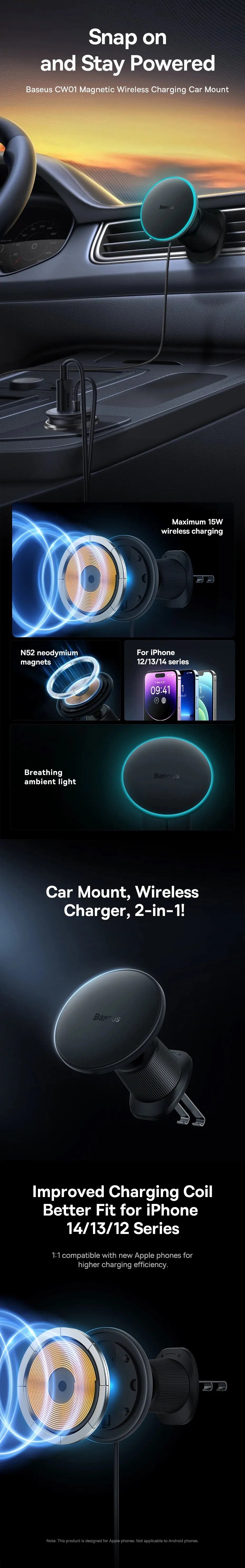 The Baseus 2-in-1 Wireless Car Mount Charger is a convenient solution for MagSafe enabled Apple iPhones (12-15 Series). With a 15W output, it rapidly charges your phone during road trips, ensuring a full charge in about 3.5 hours. The all-in-one design includes a 25W fast car charger adapter, eliminating the need for an extra high-power adapter. The stable magnetic mount, powerful N52 neodymium magnets, provides secure support with a 360° rotatable design. An ambient light ring indicates charging status, and an independent switch ensures control over the wireless charger, preventing overcharging and enhancing battery health.