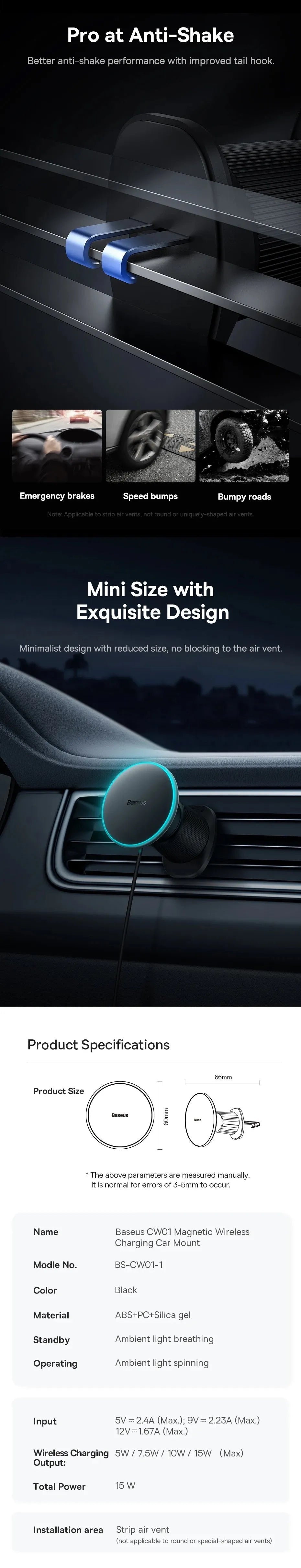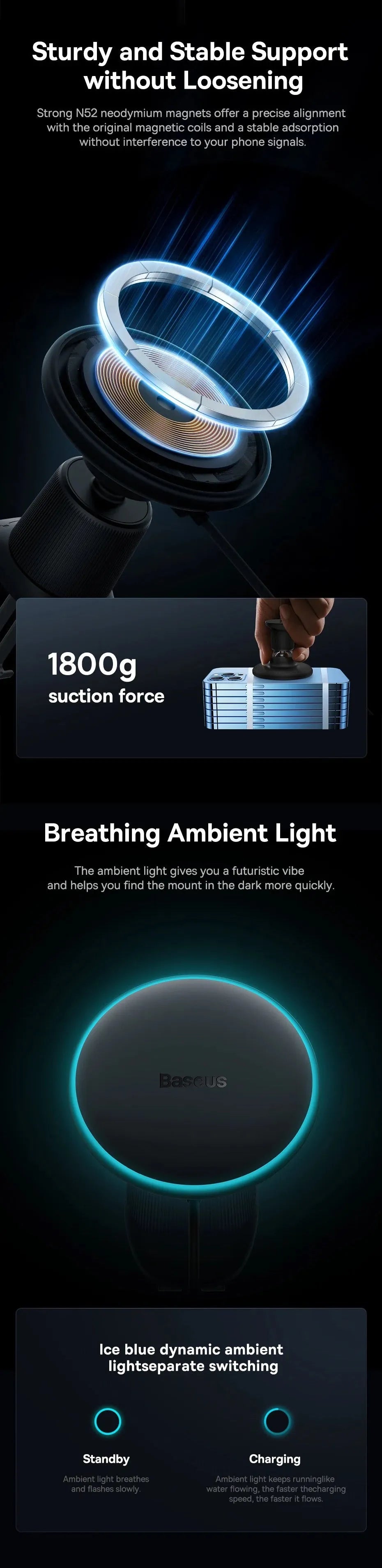 Mount with Ambient Light Ring: The ambient light ring serves as an indicator for various charging statuses. The wireless charger features a separate switch for convenient control, allowing you to turn it off once your battery is fully charged to prevent potential damage from continuous charging.