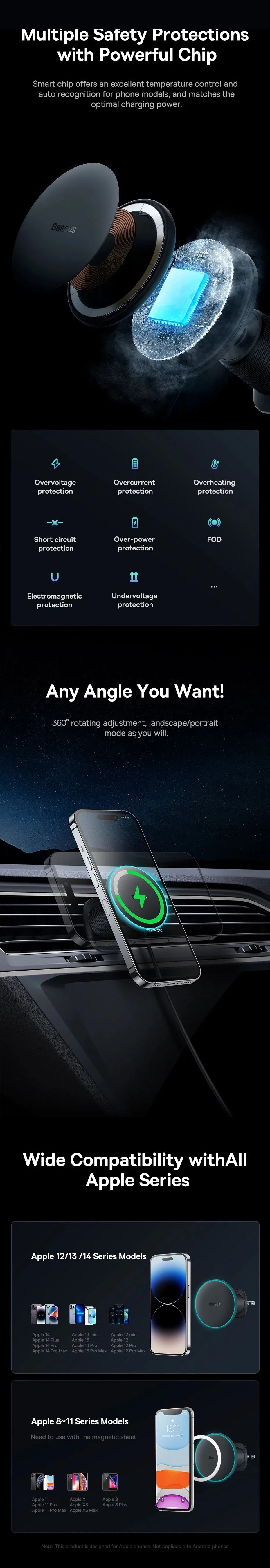 Magnetic Phone Mount for Cars with 15W Power: Featuring a larger copper charging coil, this mount delivers a robust 15W power output, capable of fully charging your iPhone in approximately 3.5 hours while you drive. The advanced AI chip guarantees charging safety through multiple protection circuits, eliminating concerns about over-temperature and overcurrent issues. Ensure the health of your phone battery at all times.