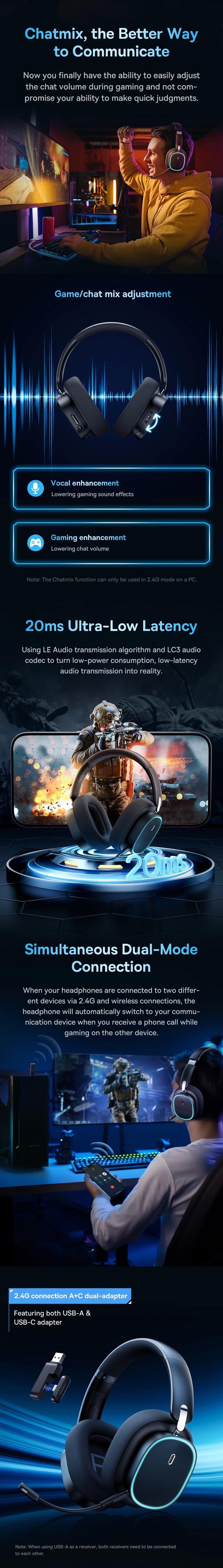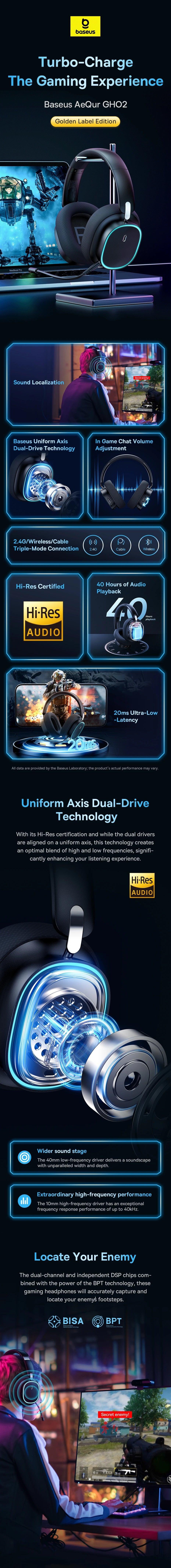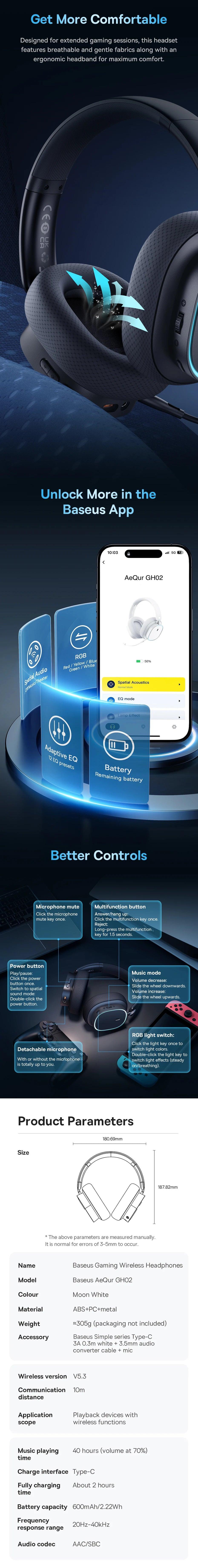 Experience unparalleled audio quality with Baseus AeQur GH02 Headphones. Uniform Axis Dual-Drive Technology, aligning dual drivers for optimal high and low frequencies. Enhance gaming precision with dual-channel DSP chips and BPT technology, pinpointing enemy footsteps. Stay connected and communicate seamlessly with Chat Mix volume adjustment. Enjoy up to 40 hours of gaming with enhanced battery life. Achieve ultra-low latency of 20ms with LE Audio transmission. Seamlessly switch between devices with Simultaneous Dual-Mode Connection. Immerse yourself fully with five ambient light options.