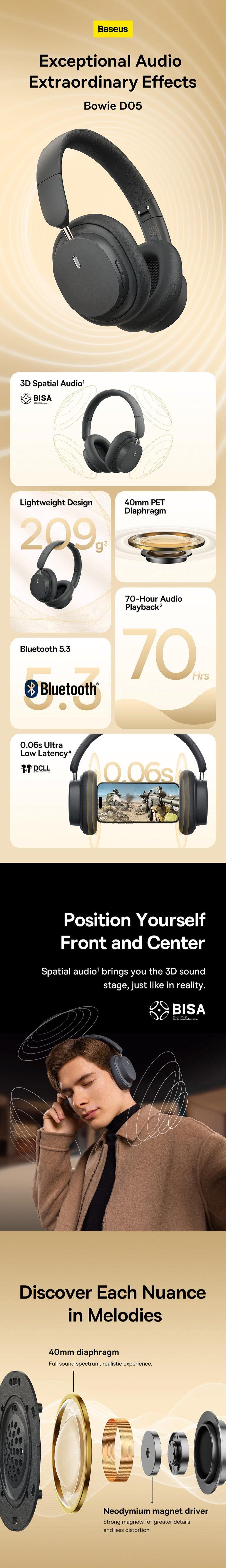 Baseus Immersive Spatial Acoustics: The Baseus Bowie D05 Headphones provide an expanded sound stage that envelops you in the realm of digital visuals and audio.