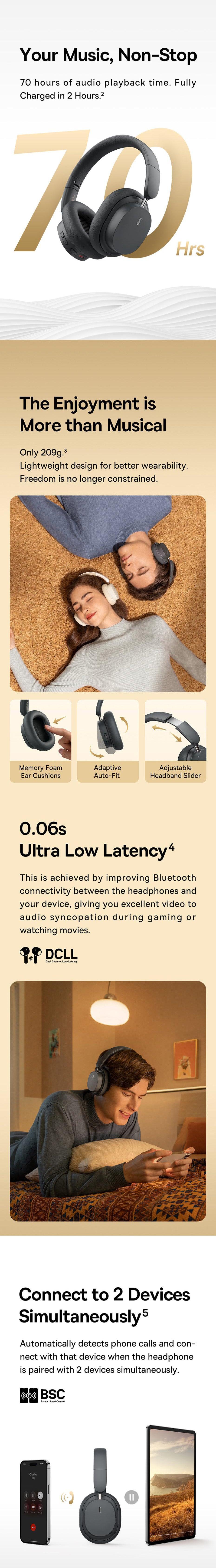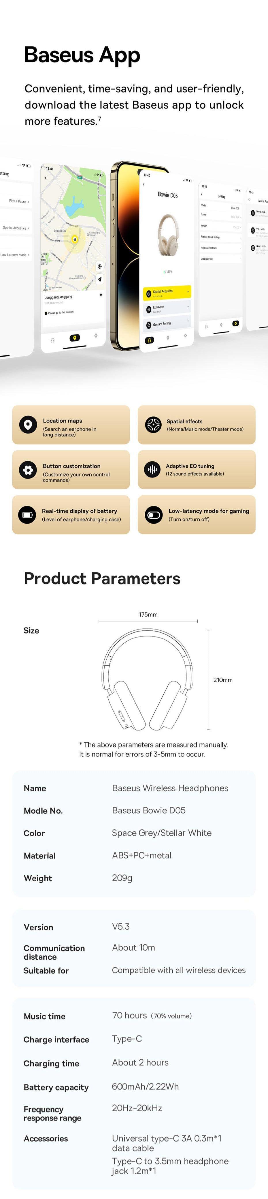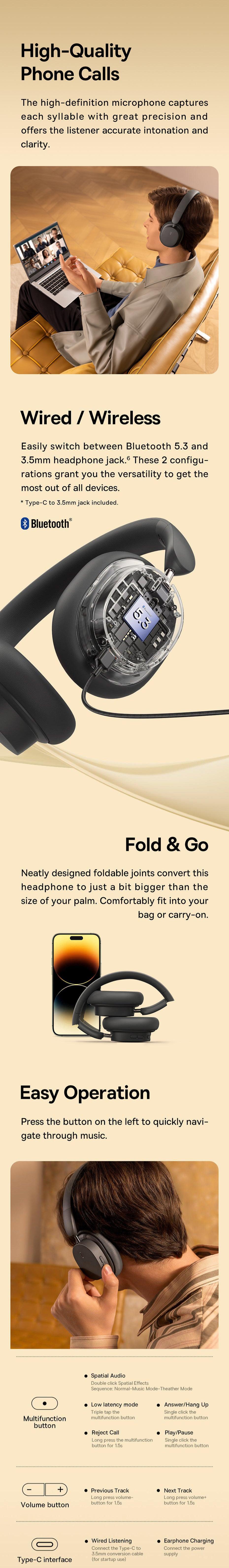 Baseus Immersive Spatial Acoustics wireless Bluetooth headphones. With an extended sound stage, lose yourself in digital audio and visuals. Featuring Advanced Wireless 5.3 for synchronised, robust dual-channel connectivity. Revel in 70-hour playback thanks to larger batteries. Baseus Channel Low-Latency achieves 0.06s delay, perfect for gaming and videos. Foldable design enhances portability. Also, connect via Type-C to 3.5mm jack for versatility. Immerse, play, and connect seamlessly with Baseus headphones.