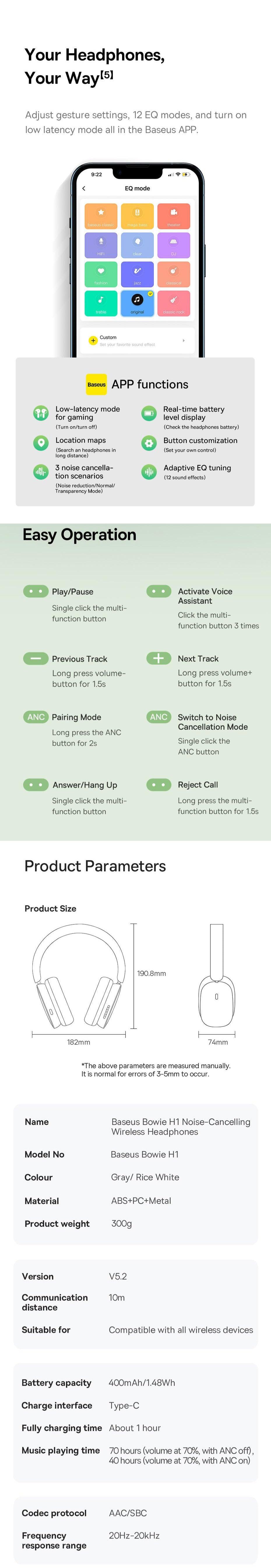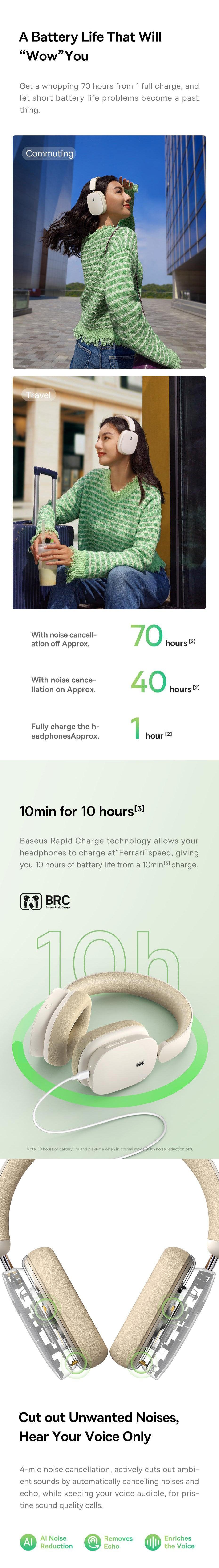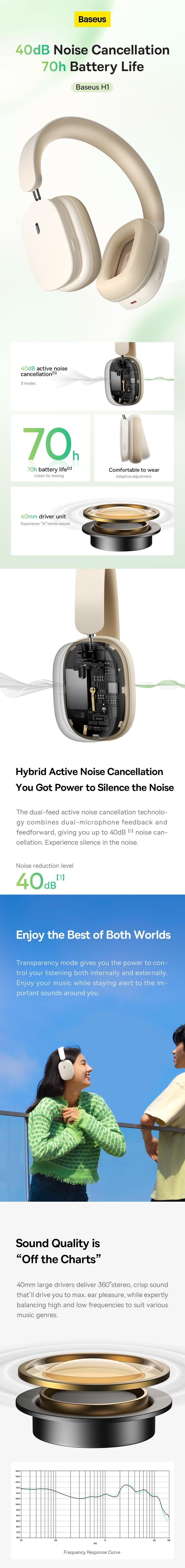 Baseus Bluetooth wireless headphones with Hybrid ANC technology providing versatile noise cancellation modes, up to 40dB noise reduction. Enhanced by Advanced Wireless V5.2 for stable earphone connectivity. Clear calls with Four ENC Mics utilising neural network algorithms. Environmental Monitoring Mode captures ambient sound for seamless conversations. Enjoy immersive sound through the 40mm Full Range Audio Unit delivering deep bass and 3D audio. Extended battery life, up to 70 hours, with an 400mAh high-capacity battery for a week's use. The ultimate wireless headphone experience with cutting-edge features for audio and communication needs.