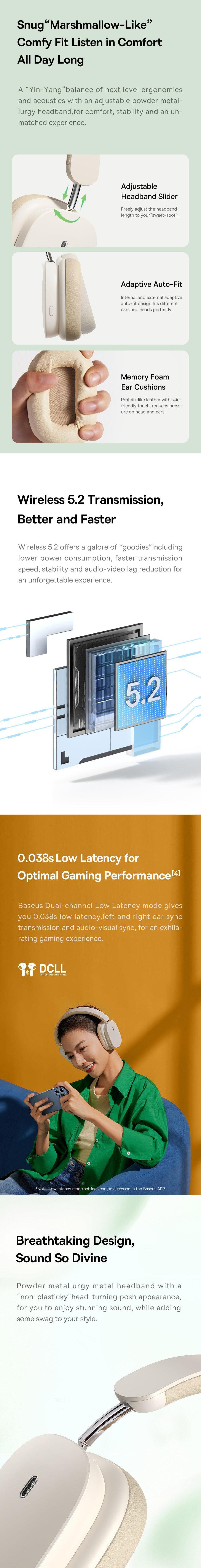 Advanced Wireless V5.2: The Baseus headphones H1 features a smart 5.2 chip that ensures a stable and synchronized connection between the left and right earphones, operating independently.