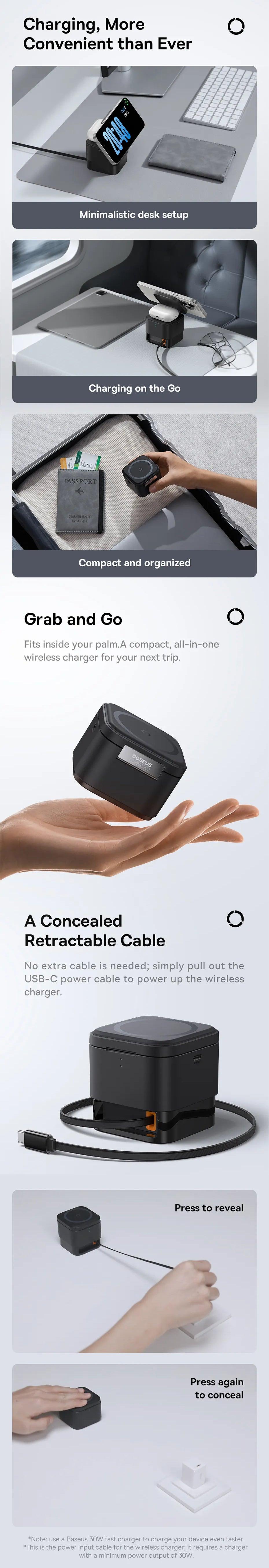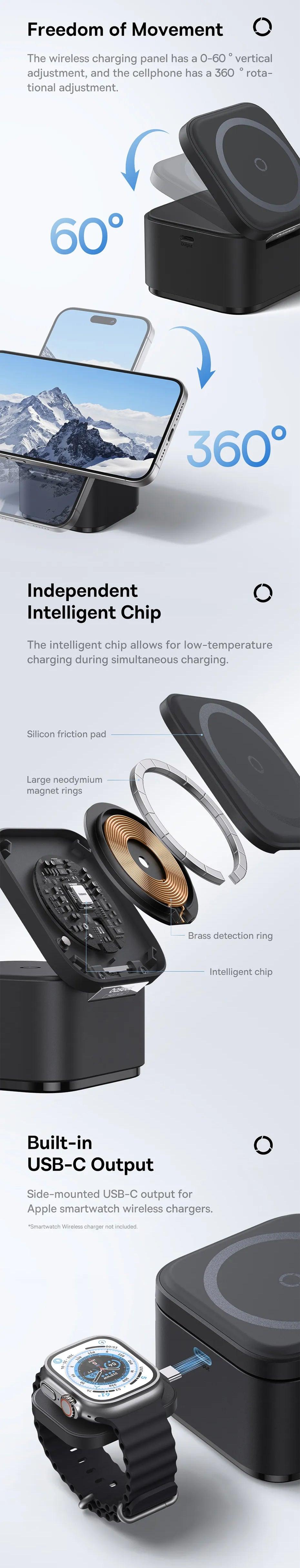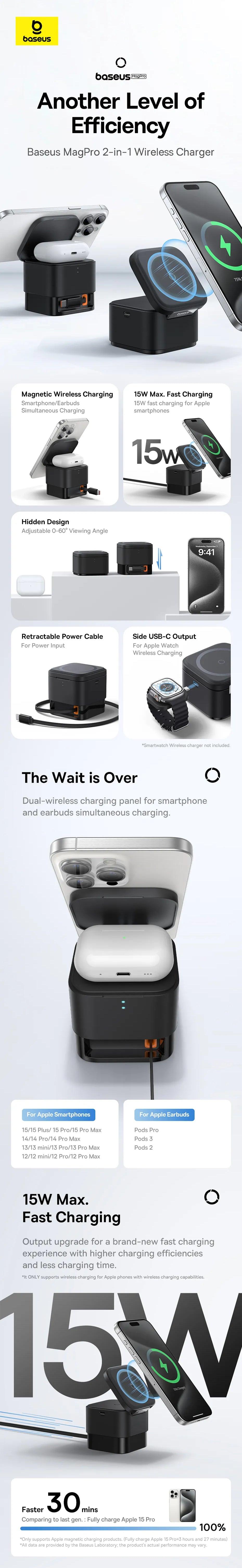 Baseus MagPro Magnetic Charging Combo—a versatile solution for Apple users. This device facilitates simultaneous wireless charging for iPhone and AirPods at up to 15W. The built-in retractable cable connects seamlessly to a 30W or higher power adapter, ensuring efficient charging. With hidden storage for cable management and a convenient press-to-raise base, it offers ease of use. The 60° foldable design enhances versatility, accommodating both landscape and portrait modes. Experience a sleek and functional charging experience tailored for your Apple devices.