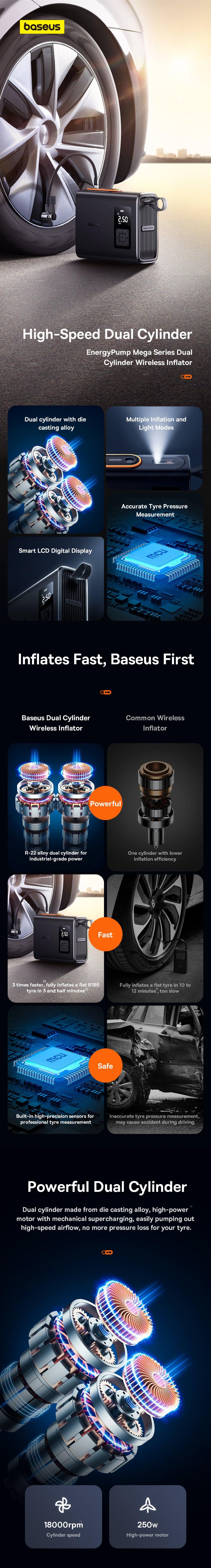Baseus Tyre Inflator Portable Car Air Compressor 250W Dual Cylinder Pump 6000mAh